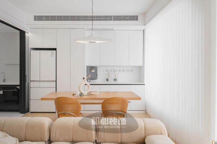 洁白的柜体通过干净的线条切割,温雅中别具简约;原木餐椅则是给空间增加了朴素气息;纯净轻盈的白与优雅沉稳的木色,似分即合,是治愈感和舒适感的最大来源