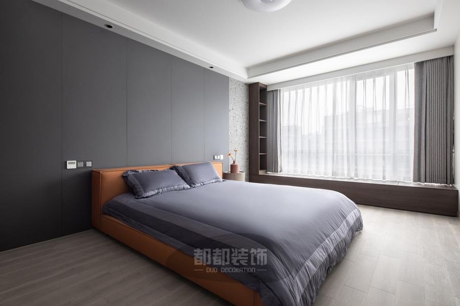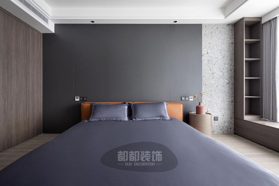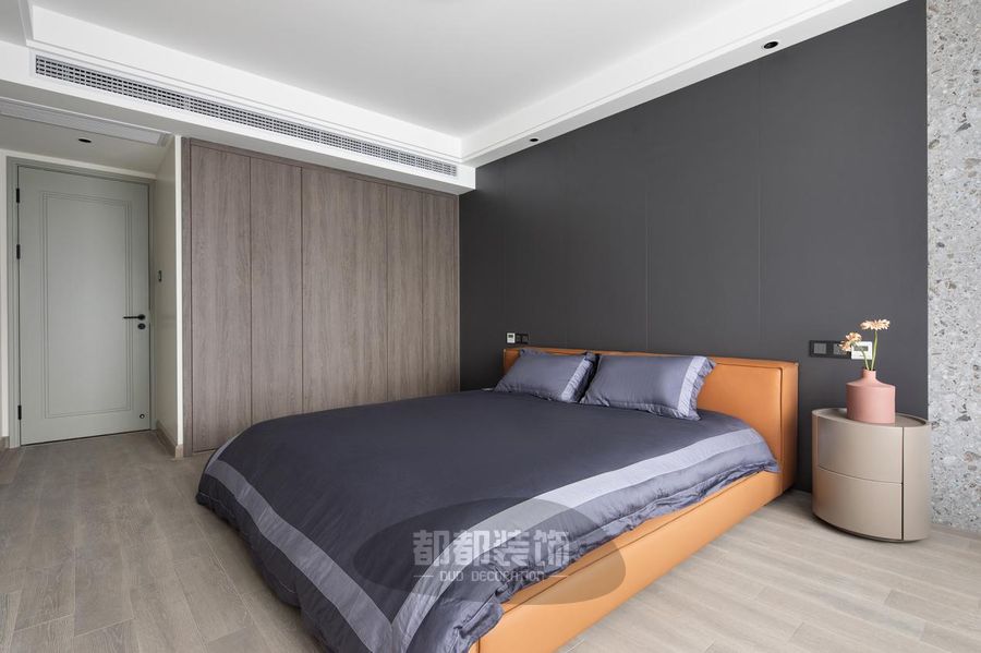 高级灰搭配深胡桃木色的主卧空间,用橙色点缀,优雅时尚的配色与现代材质相结合,呈现出简约大方,个性鲜明的家装风格;定制墙柜以木饰面覆盖,将空间的清新与温润延伸。