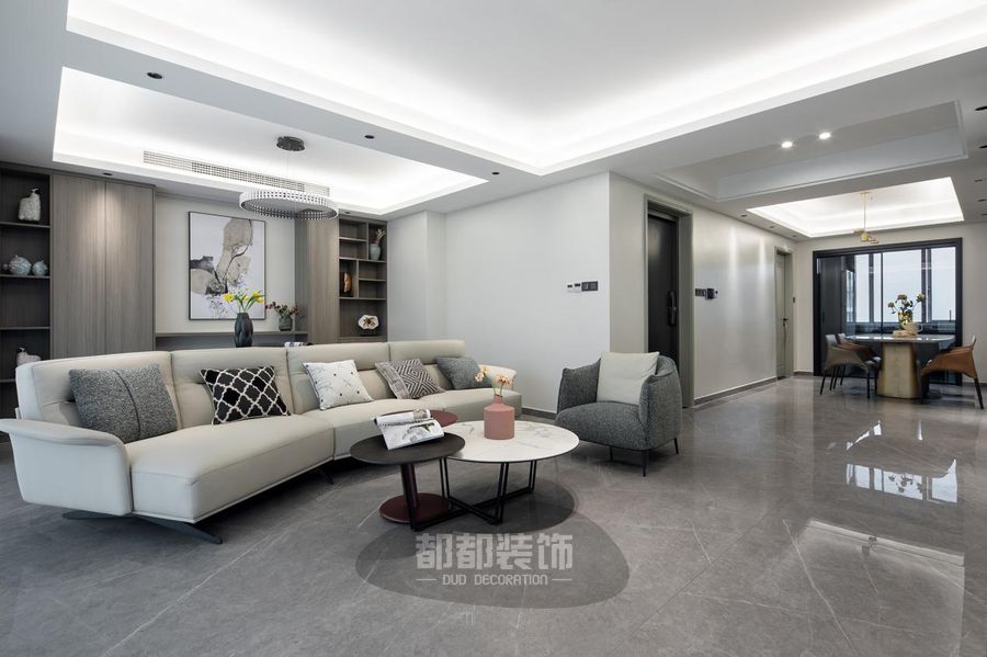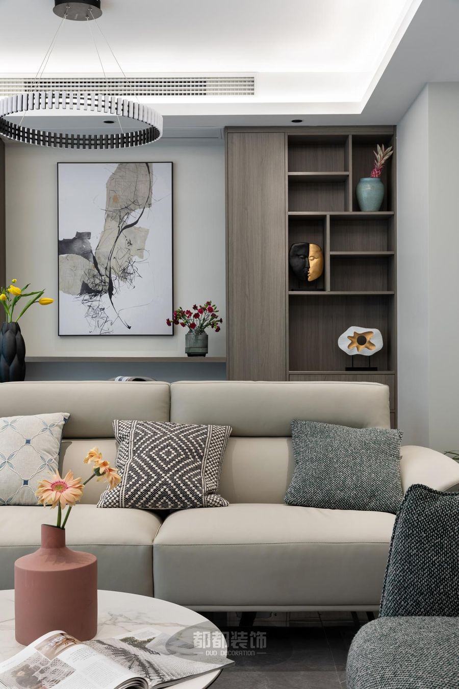 客厅以奶茶色为基调,纯粹的白色吊顶和纱窗塑造出素雅的视觉氛围,随着日光洒落缓缓升温,温暖、舒缓被最大程度地释放到空间里。