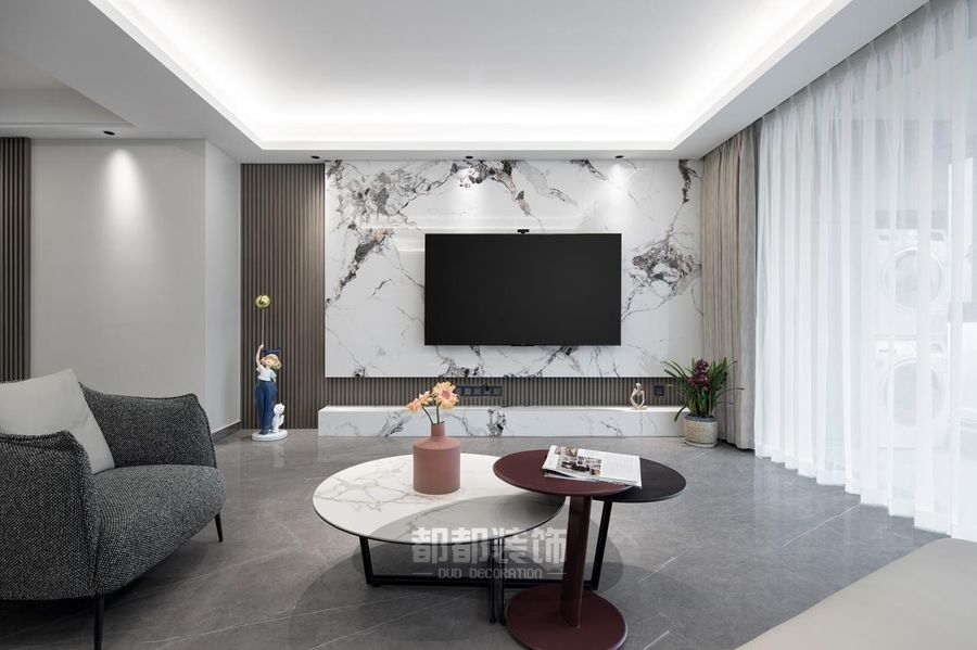 沉稳的棕色格栅,加入大理石质感的背景墙,摩登感十足,也让极简中渗透着轻盈的奢感;下方的少年雕像和绿植的加入,使整个空间都灵动、活泼起来。