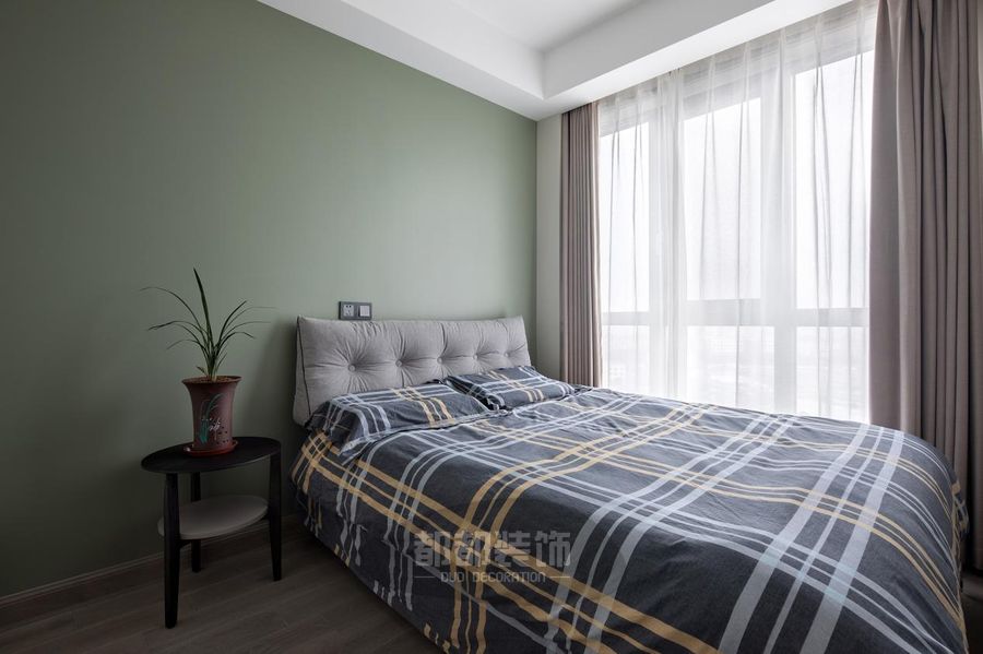 恬静而舒缓的卧室空间,有了阳光的加持,让空间气质更显高级;绿色背景墙和床头的一抹绿植,带来了丰富的视觉观感与舒适的空间氛围感。