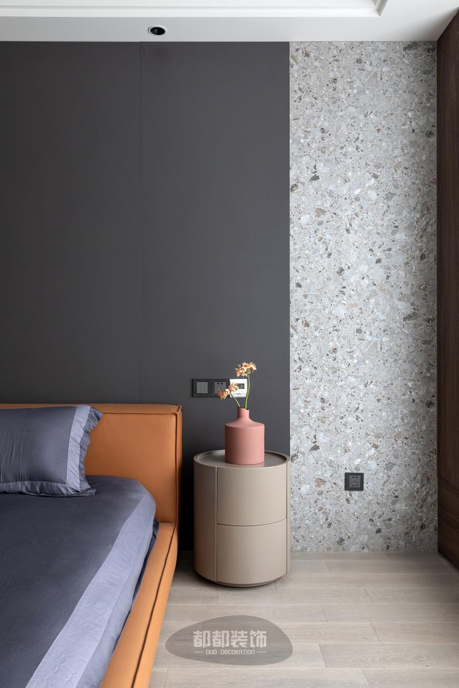 床头右侧增加了灰色大颗粒水磨石背景墙,浅棕色圆形床头柜和橙色花束点缀其中,让空间变得更为惬意、自在。