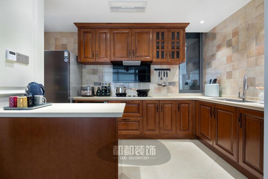 通过倚靠橱柜面形成一个简易的半倒台型开放式厨房,勾勒出一个典雅舒适的厨房空间。白色大理石台面搭配原木制柜体,中西结合、充满格调,天然健康环保的纯实木柜体,流露出自然原始的生活气息,符合现代人追求的品味。