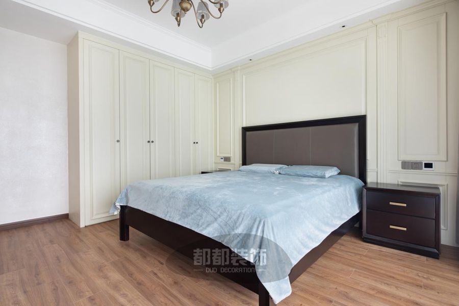 衣柜表面的矩形线条造型做出美式的对称和层次感,加入了柔软的床上用品,空间有一些柔和的对比。背景墙用石膏线勾勒,与衣柜设计相类似,赋予了更多的典雅气息。