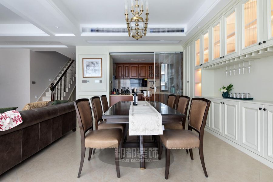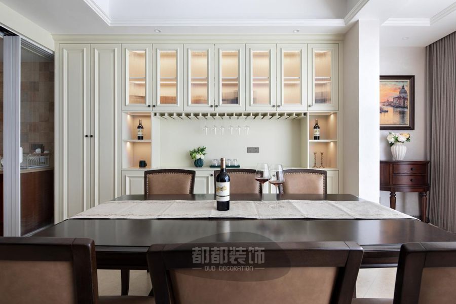 客餐厅一体式设计,以乳白色和深棕色为主要色,整面墙的柜子满足日常收纳需求,顶层收纳区采用磨砂玻璃做柜门,方便识别取物而又增添一分朦胧美,中间开放储物区,放置绿植和透明玻璃杯,在实用的同时也提升了餐厅颜值,金属拉手时尚美观又大气。