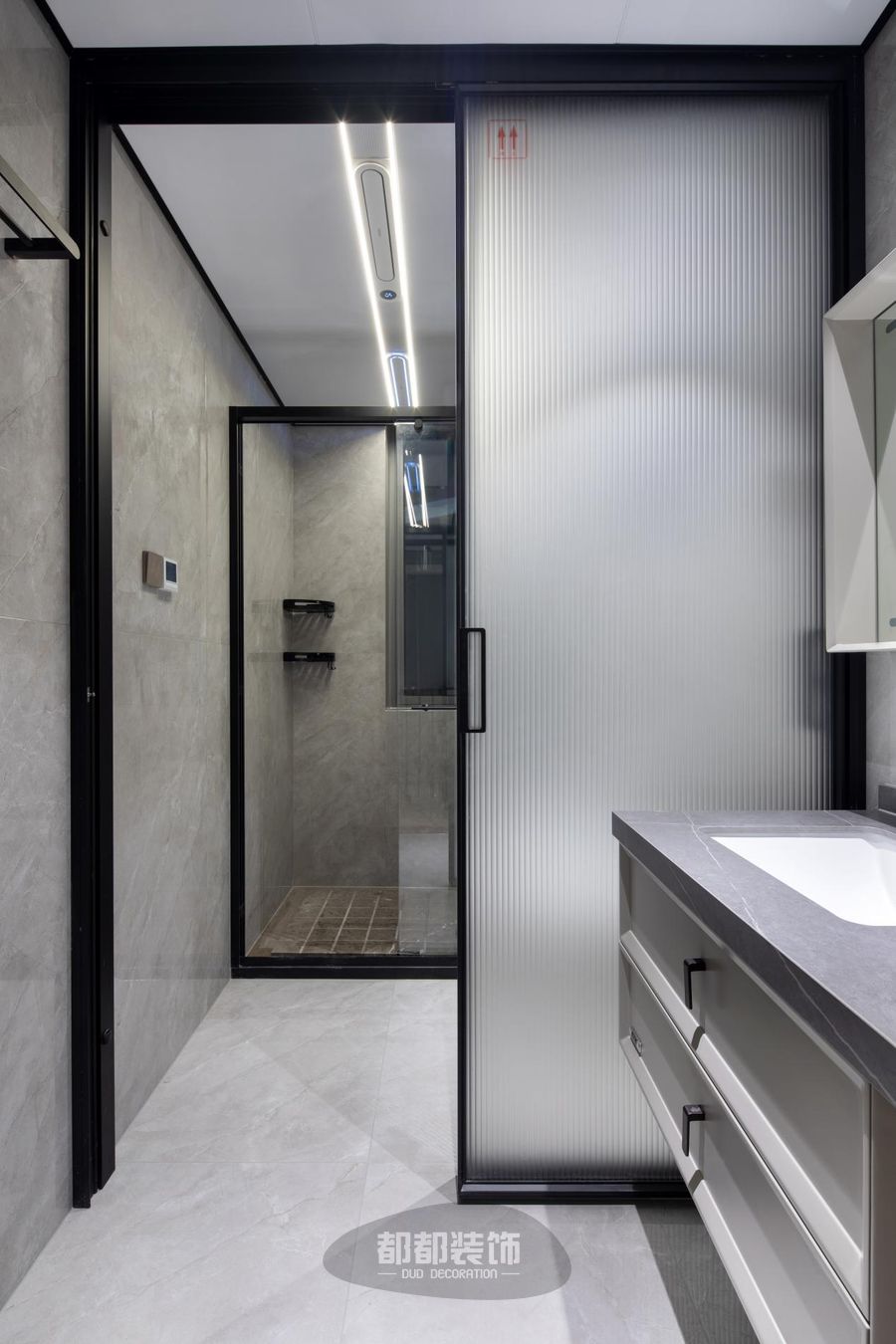 卫生间墙面铺贴大尺寸的大理石纹灰色瓷砖,地面也延续同款的款式,淋浴区则采用浅褐色小瓷砖通铺,自然而然分割出干湿两区,洗脸台和镜柜则选用醒目的白色,让卫生间通透、大气、明亮。