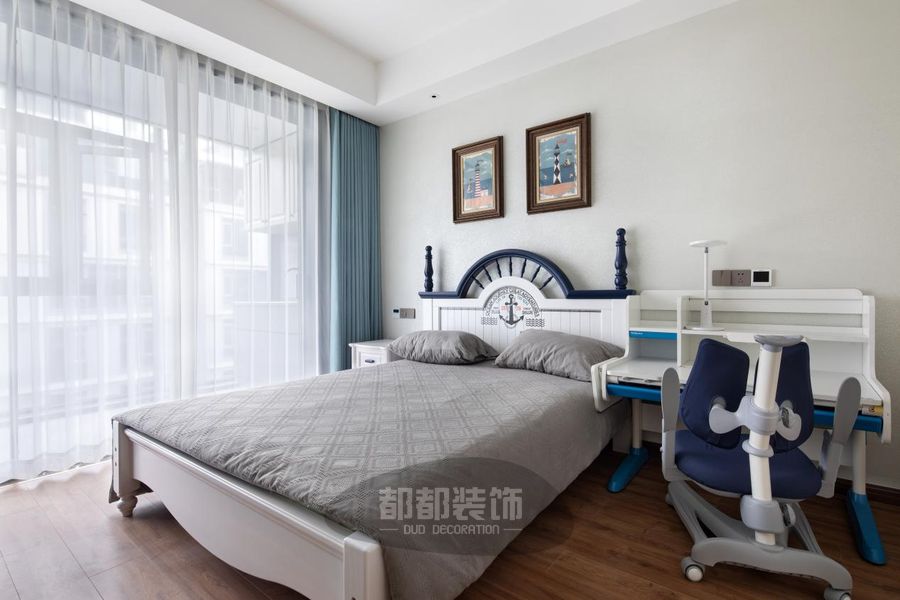 儿童房主打地中海设计,蓝白配色给房间带来一种清凉、自由的享受,海洋的魅力得到最大程度的释放。深蓝色海洋风船舵设计感十足的床头板,让睡觉都成为了一种乐趣,背景墙点缀风塔漫画装饰画,富有童真童趣之感。