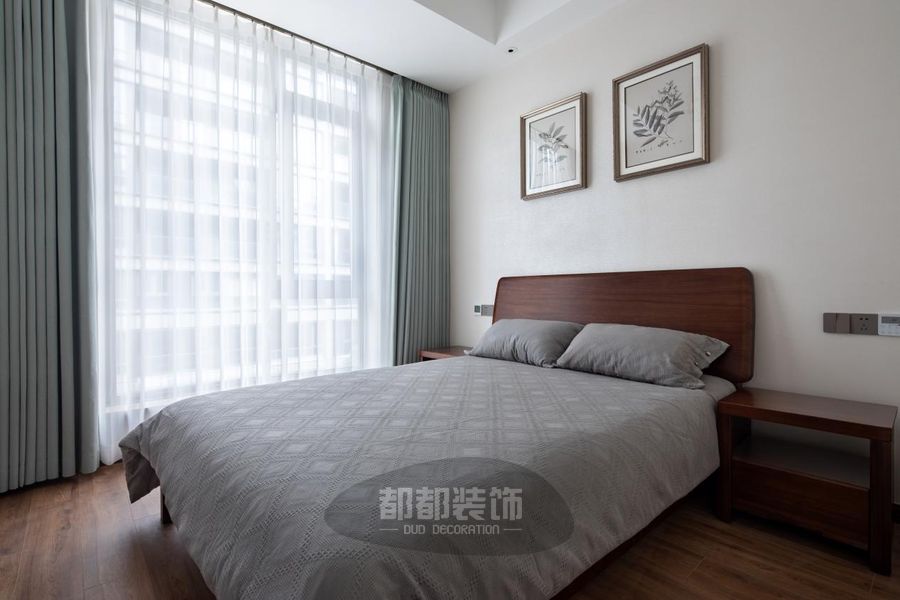 两间次卧设计相近,背景墙简单朴素,分别用草木和建筑装饰画点缀,原木床体配合着木地板,给人以清爽自然之感。整面墙的落地窗设计,朝阳的方向让空间更加明亮,双层窗帘的选用在满足隐私性的同时还具有超强的遮光性。
