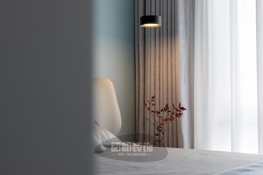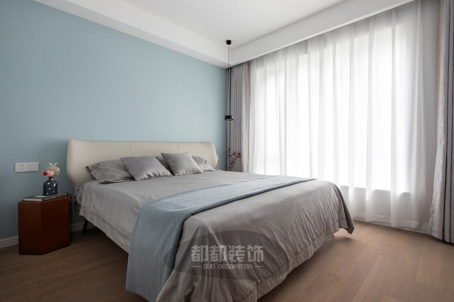 主卧地面通铺木地板,浅蓝色背景墙与温柔的床品相呼应,柔和且宁静。黑色金属吊灯,线条感流畅,给空间注入满满时尚感。