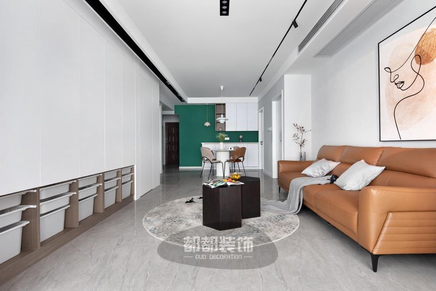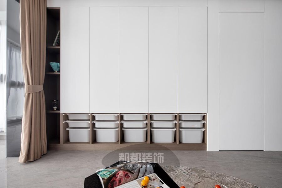 设计师摈弃了传统的电视墙,在整面墙的收纳柜前面设置投影幕布,纯色隐形门恰好可以做背景墙,小空间也可以享受电影院氛围。左侧装饰柜开放式设计,弱化了柜子的厚重感,更为空间增加了层次感,还能摆放心爱的摆件,起到了画龙点睛的作用。