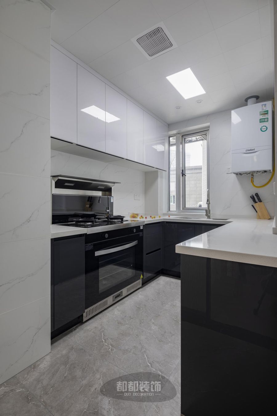 U型台面功能分区明确,水槽台面根据业主需求采用了加高设计,避免小孩碰撞的危险。