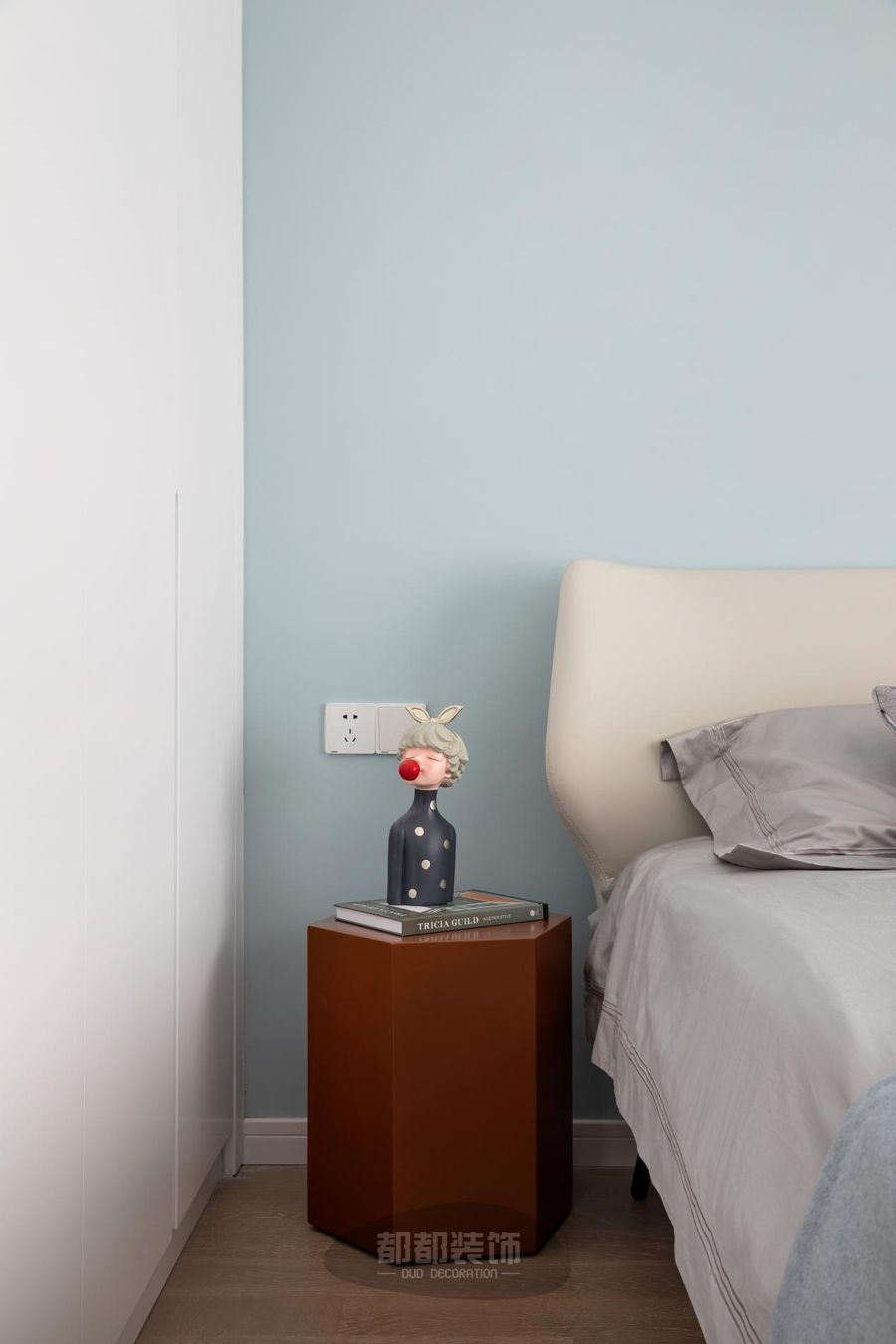 六棱柱造型原木床头柜上放置书籍和文艺摆件,简单而不简约。