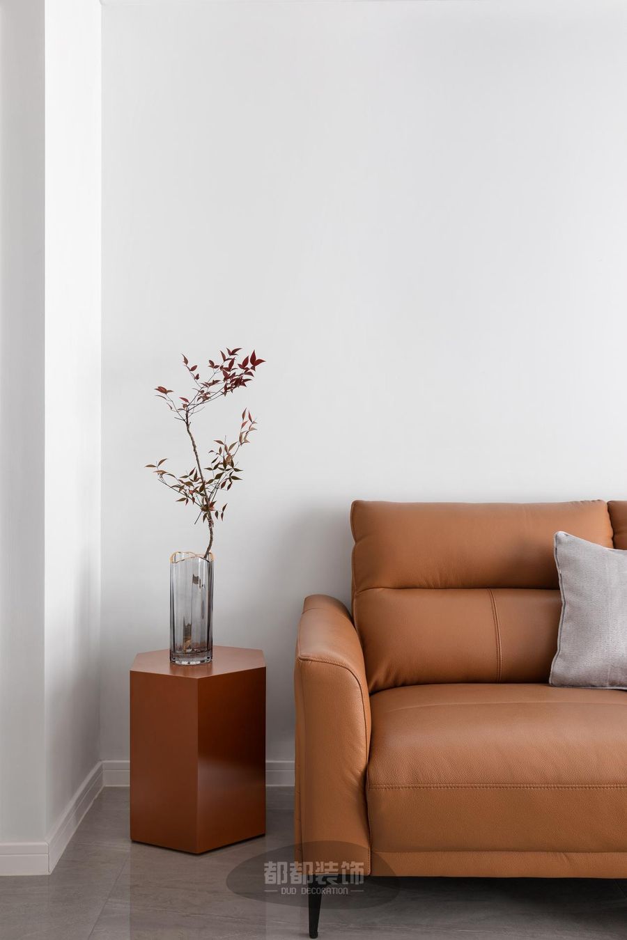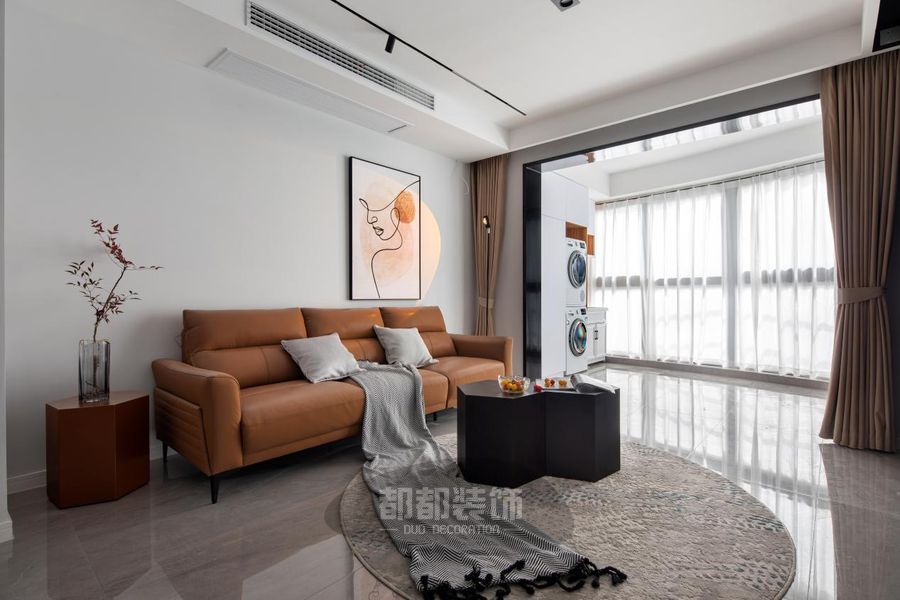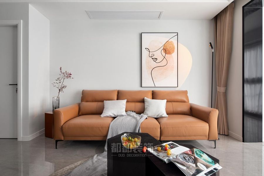 沙发采用舒适柔软的纯棉面料+皮质面料,灰色+橙色搭配起来有强烈的视觉冲击力,整个客厅顿时活力满满,上方的简约装饰画搭配落日灯,现代、前卫。