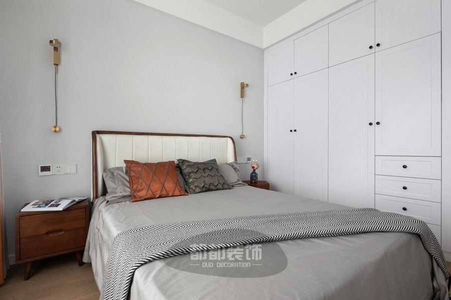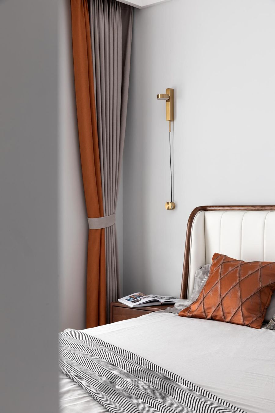 窗帘和靠枕的亮橙色正好中和了灰白调的清冽感,为居室注入一抹恰到好处的温柔与温度。床头两边装饰金色全铜壁灯,氛围感升级。