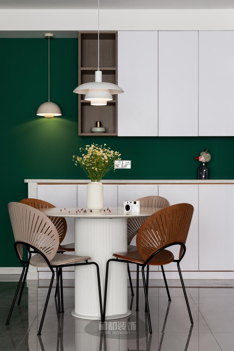 餐厅中加入了金属元素,自带光芒,点缀现代白色花苞吊灯,创意满满,让简约的餐厅呈现多元化,墨绿色墙面配合着原木柜体,也让空间的层次和色调更加丰富。