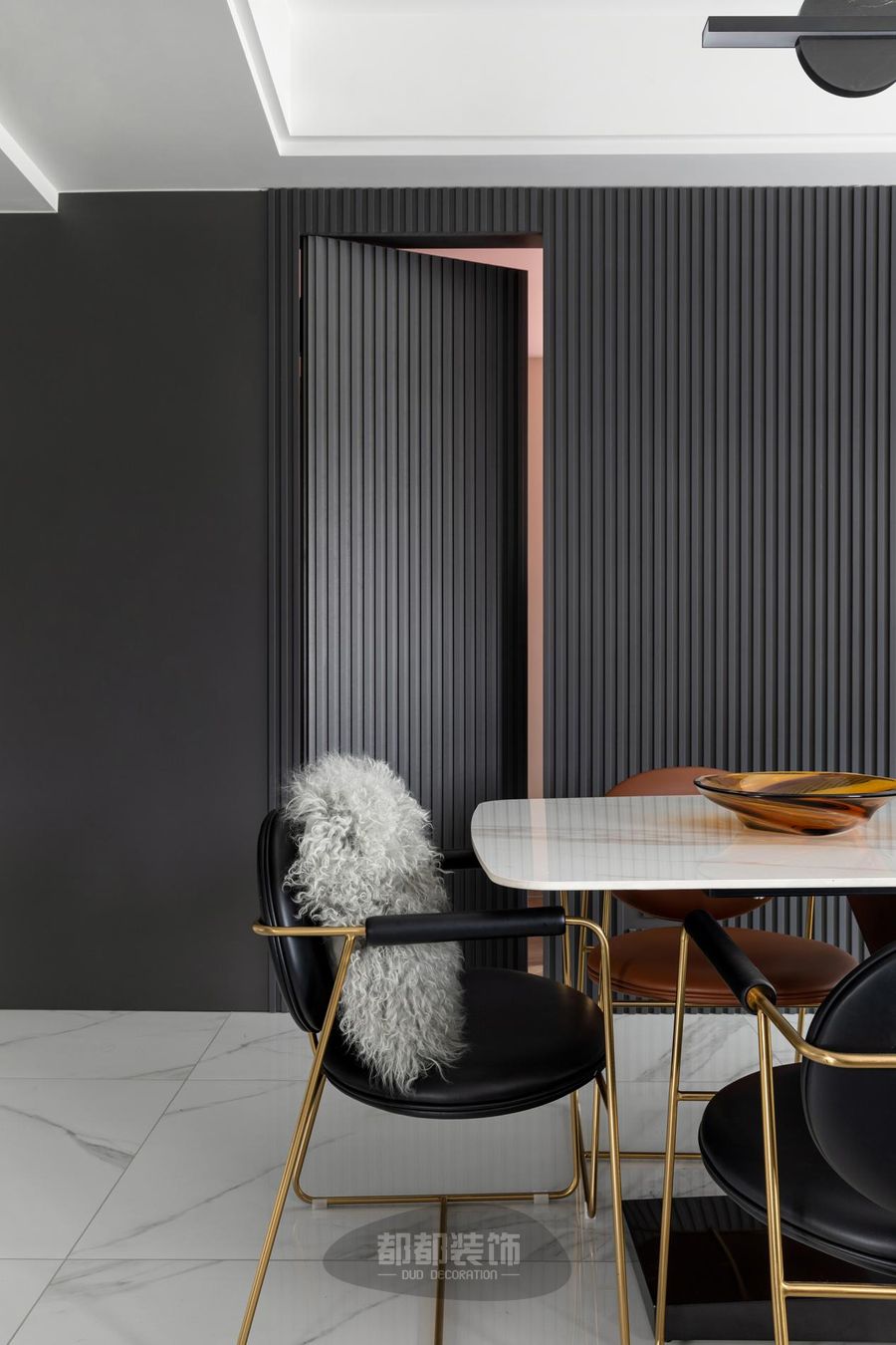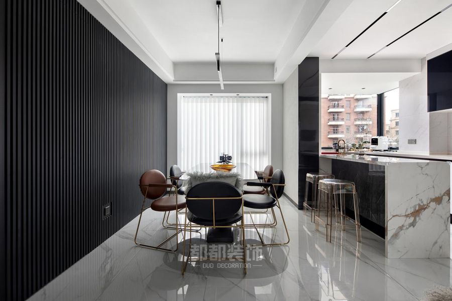 餐厅布置金色铁艺真皮餐椅与大理石亮面餐桌,干净利落,为餐厅的高雅定调,还提高了欢聚畅饮的惬意感;灰色靠垫和混色水果盘的点缀,梳理出优雅而精致的用餐氛围。