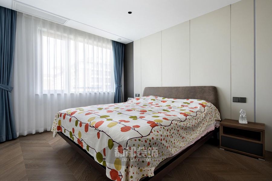 次卧沿用主卧相同的设计思路,亮点在于把床单换成了色彩缤纷的配色,增加了空间的活力,将温暖的木板进行鱼骨拼,更好地呈现出木质本身的纹理细节,让空间视觉感被无限拉长,层次分明而富有格调。