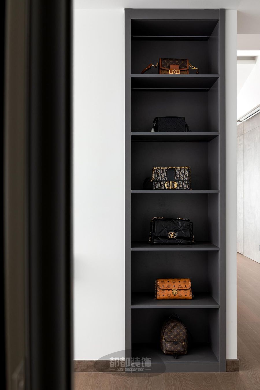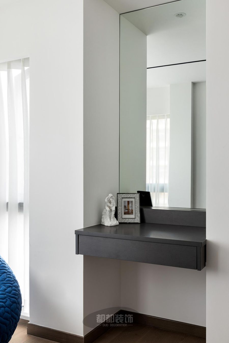 梳妆台和置物柜设计摈弃了繁芜的装饰,流畅大方,各自承担着不同的功能。通顶的玻璃满足了女主人的化妆需求,置物柜整齐放置着精美的包包,让整个墙面层次感更加丰富。