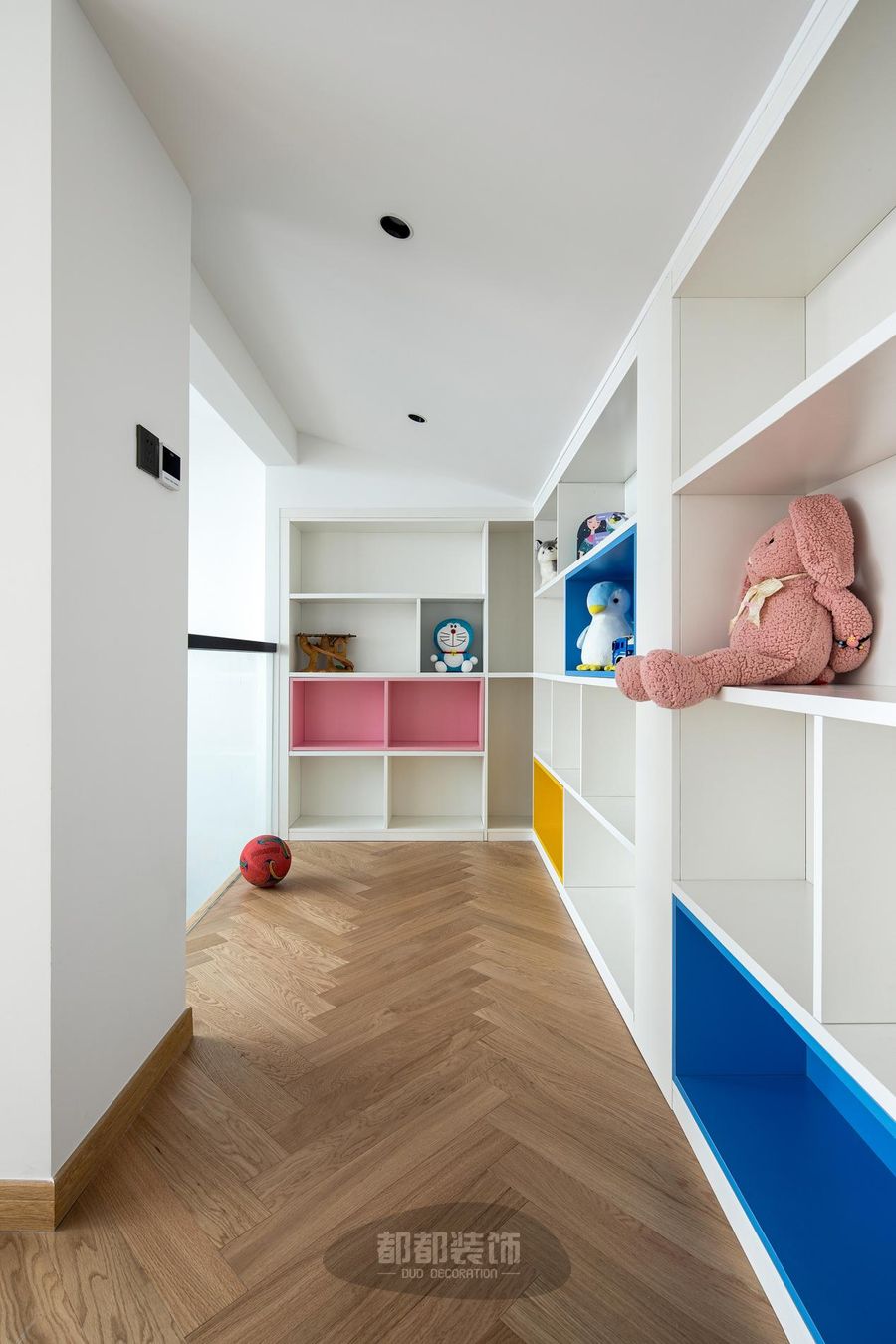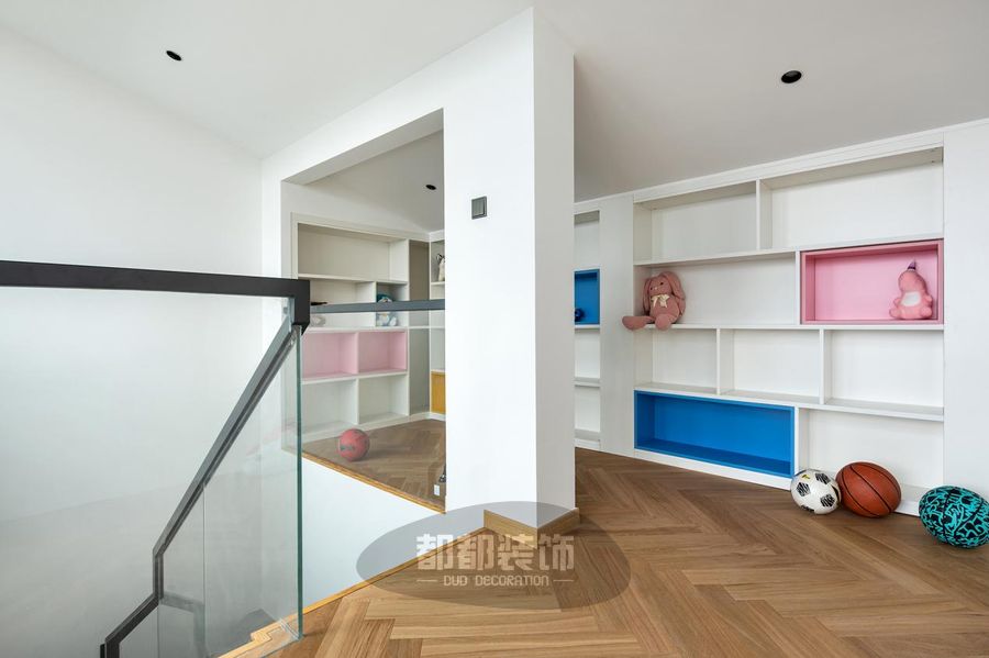楼梯侧边的通顶式柜体收纳充足,吊顶筒灯均匀分布,氛围感升级;后期也可以放置书籍,摇身一变就成了开放式阅读室。