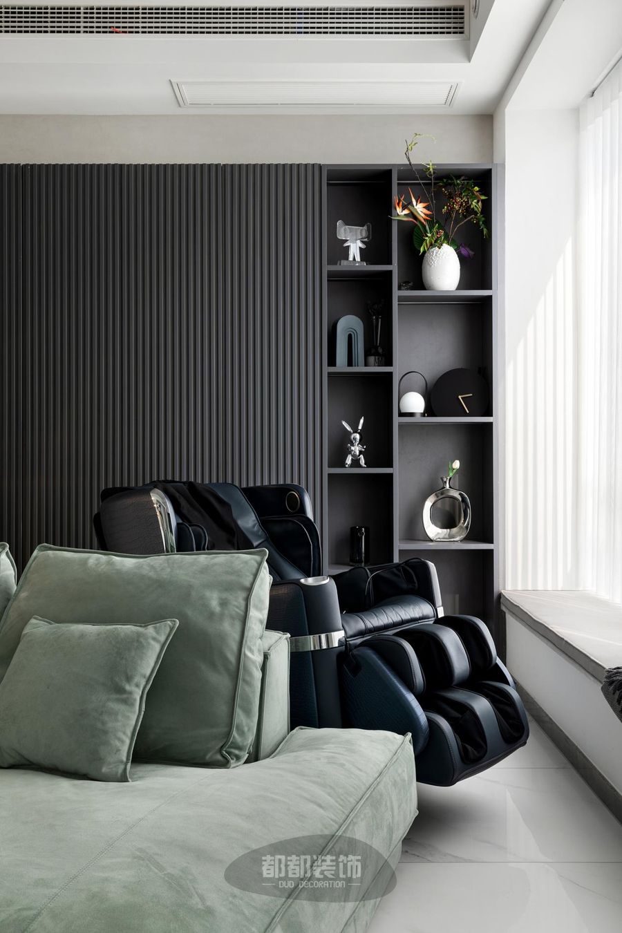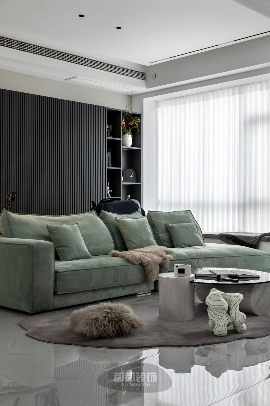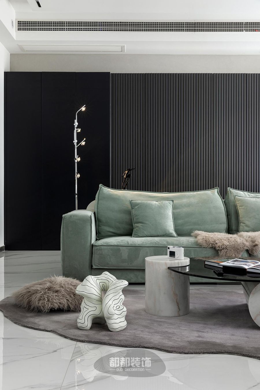 客厅嵌入黑色收纳落地柜,低调的轻奢感缓缓散开,银色艺术品和一抹优雅的绿色从中调和,储物的实用性和视觉美感协调得恰到好处。