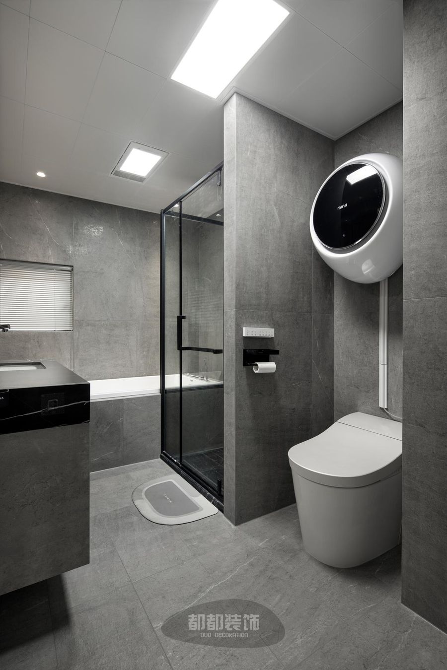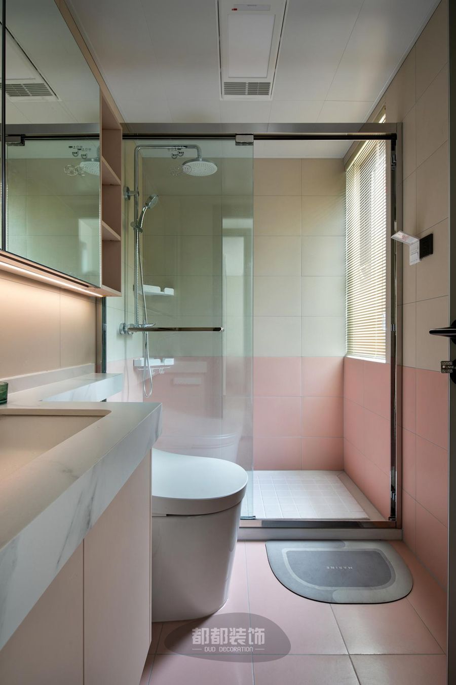 两个卫生间分别灰色、粉色的墙面与地面砖,台下盆+镜柜组合,镜柜底部顶部都装上灯带,侧边加入壁龛,在淋浴区与洗手盆之间也是装上一道玻璃门,干湿分离,呈现出一个现代时尚的卫浴空间感。