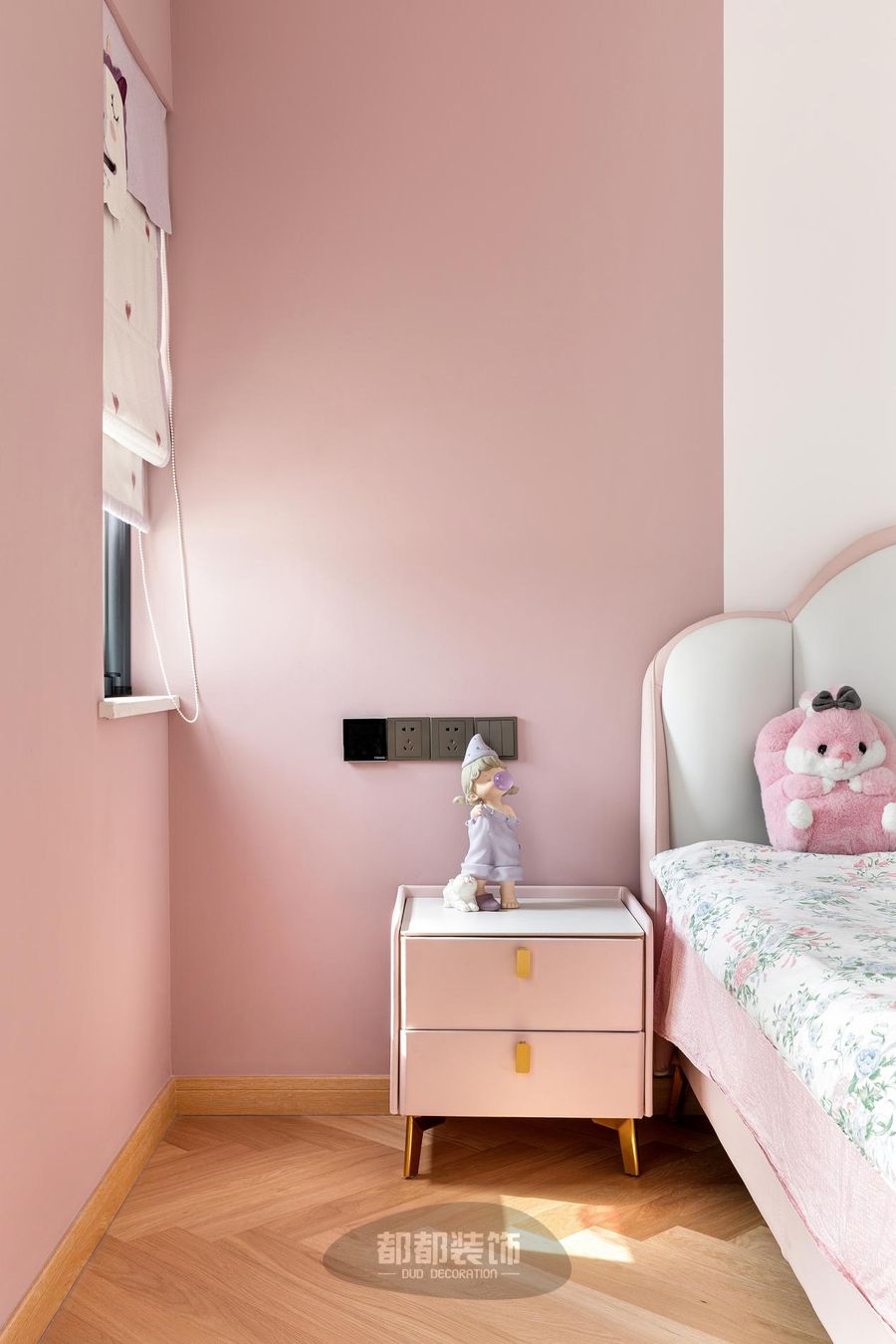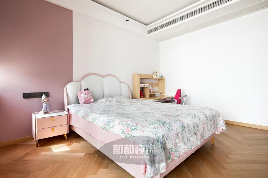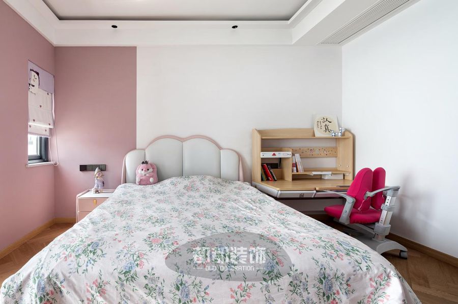 儿童房载入温柔的粉色与纯净的乳白色,浪漫梦幻,又不会过于甜腻,插入定制书桌,简而有序,空间得到合理的规划。