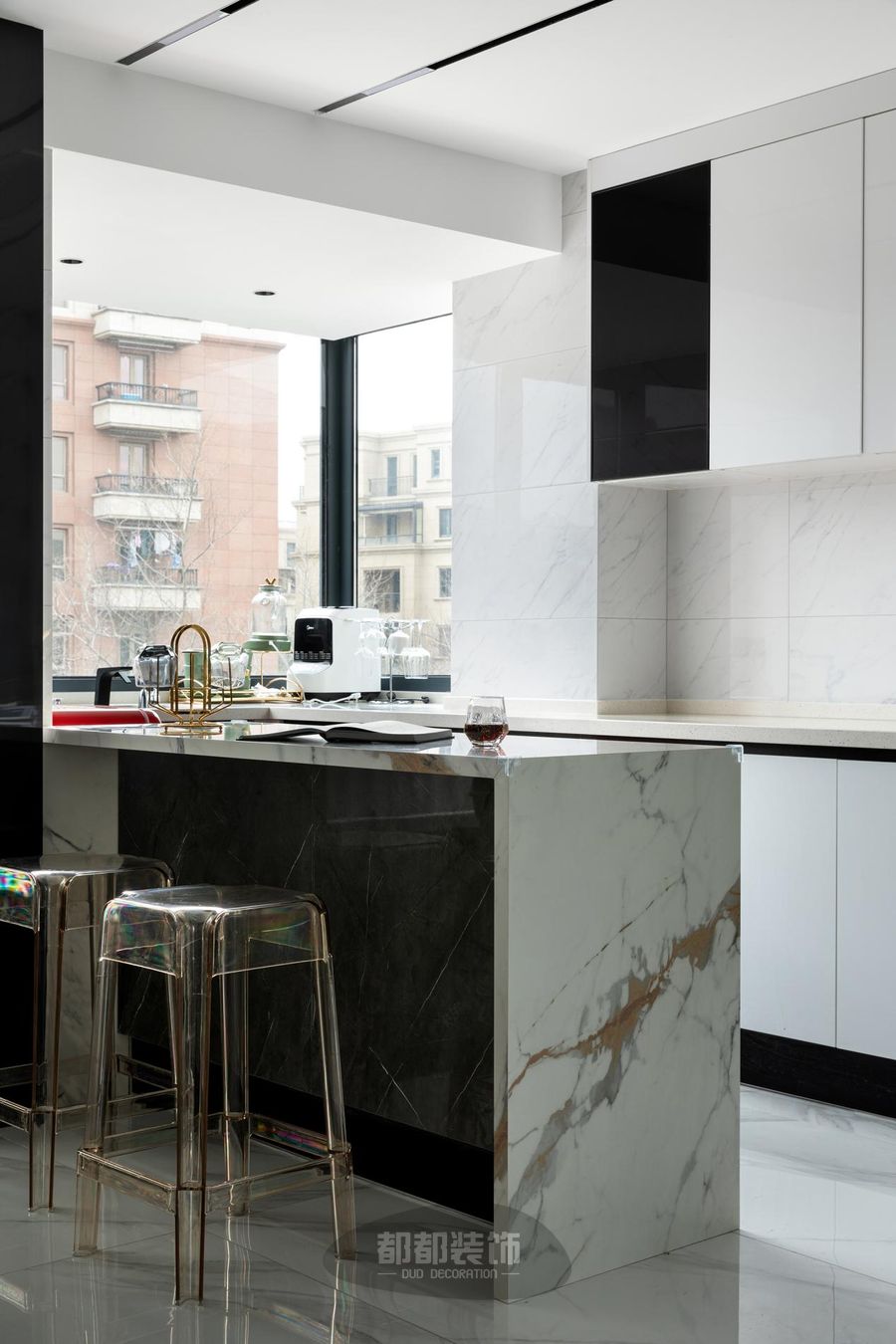 岛台以黑色、大理石纹覆盖,配以琥珀色亚克力凳子,质感与色彩的碰撞,赋予空间时尚的气息,将大气简洁弥散其间,在此尽享舒适惬意的慢生活体验。