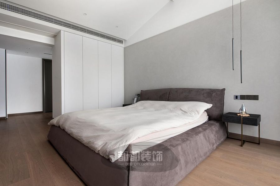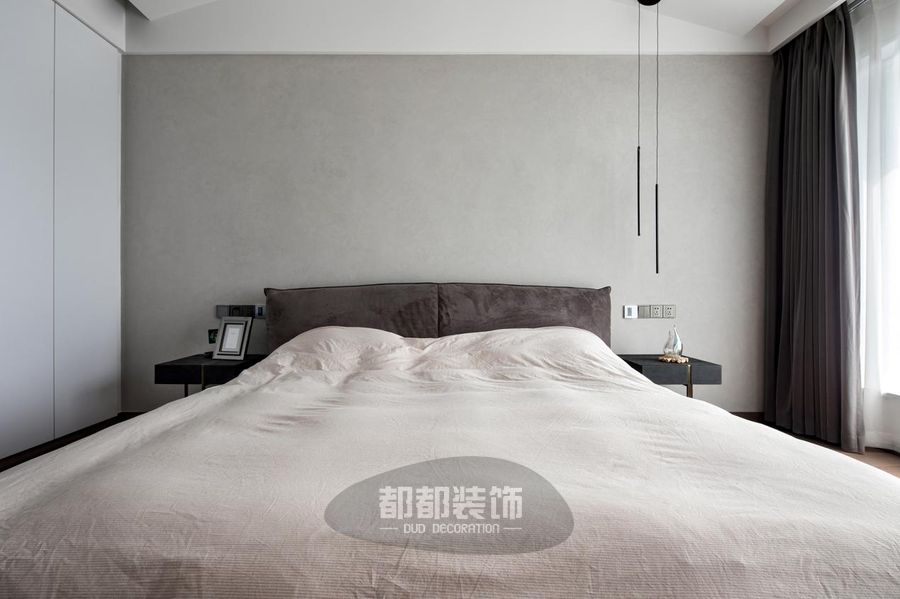 主卧墙面为水泥灰色,给人整体现代工业简约感,布置深棕色绒面床品,优雅协调;克莱因蓝曲线靠椅作为跳色,流畅的造型,时尚百搭。