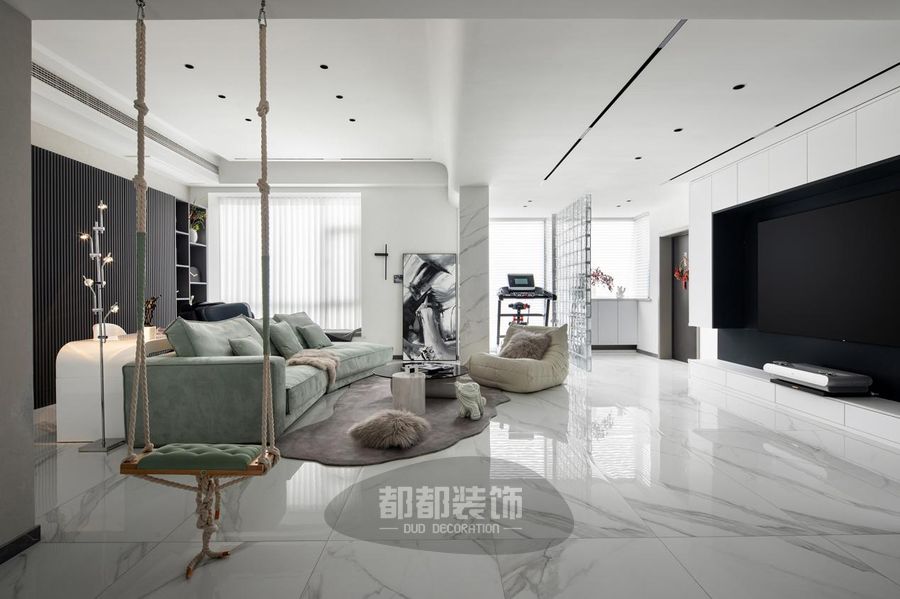 在灰白调的空间,搭配上圆形黑色托盘茶几,摆上莫兰迪绿色的绒面沙发,布置上长毛棕色抱枕点缀,让空间显得简约活泼和端庄高档;从屋顶向下延伸出来的同色系秋千吊椅,打造出随意的动感,让家的亲和与自在视野被轻盈地推开。