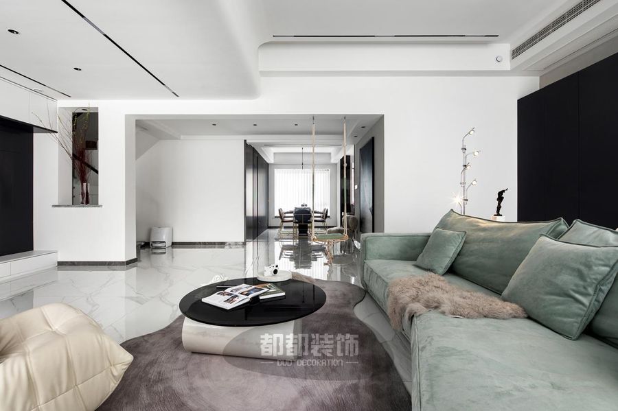 开放式的布局,秉承现代简约的写意风格,于色彩本源中萃取的白与黑,演绎独特高级的韵律美,绿色元素置入其中,激活了空间活力和生机感。