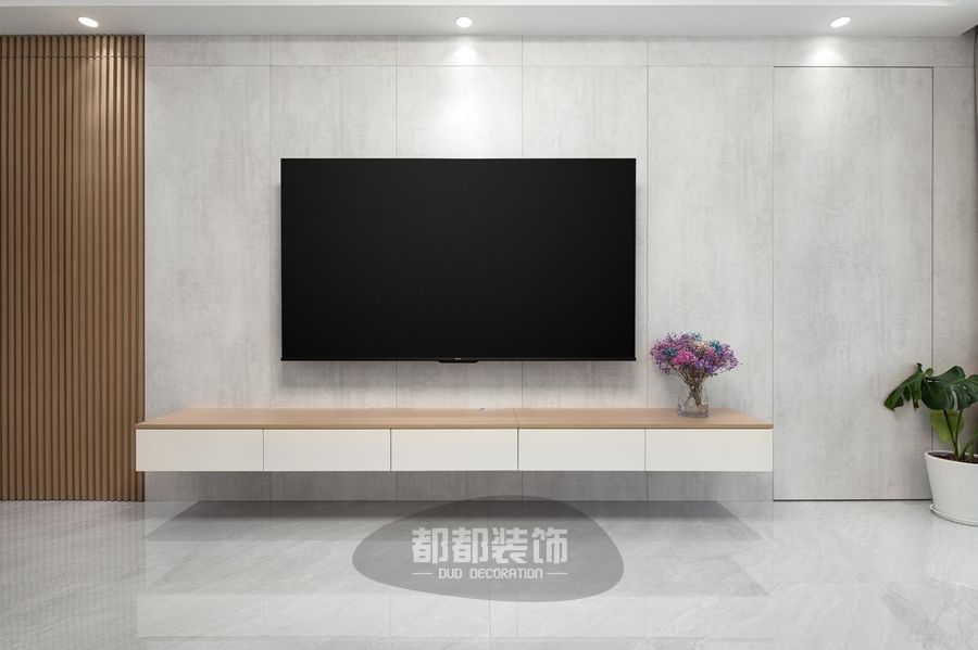电视背景墙大面积为爵士白瓷砖铺底,墙体清爽又能凸显出层次感,背景墙左右两侧打破传统对称感,左侧的棕色格栅板搭配上全身镜,设计感满满;白色实木电视柜,在自然柔和的原木激励内,凸显出朴实、分明的质感。