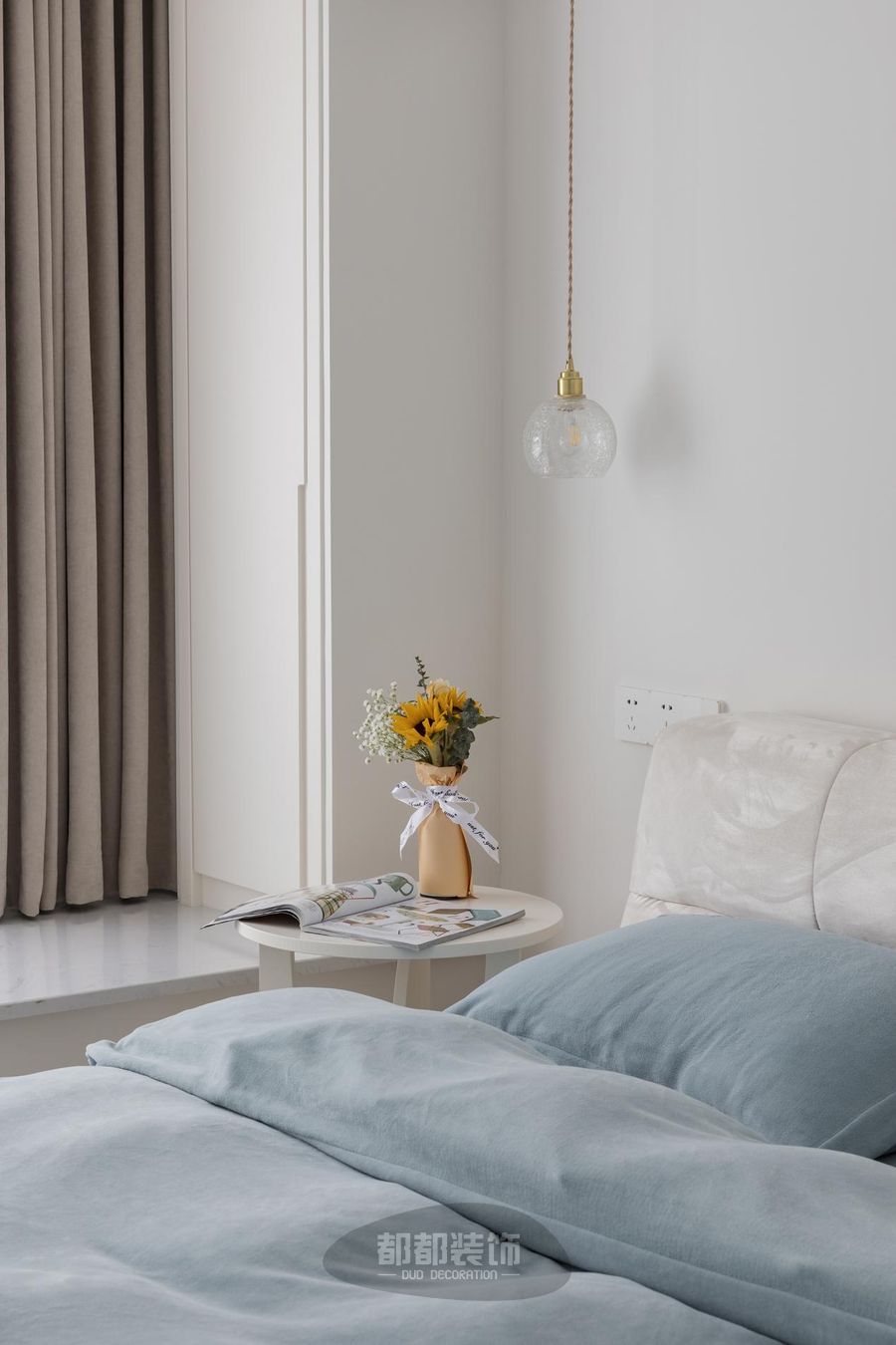 床头的白色实木圆桌,搭配上杂志和清新花束,给室内增添一股文艺气息,最大程度上展现主卧温馨舒适的一面。