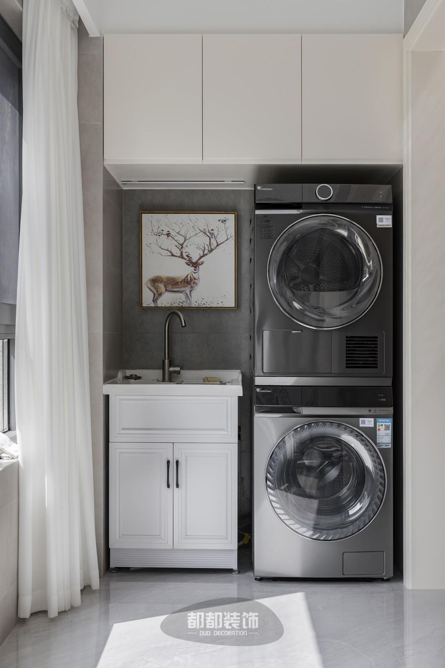 阳台柜做到顶设计,可以满足大量生活用品、清洁工具的存放,白色实木柜体用以麋鹿装饰画点缀,给人一种清新灵动之感。