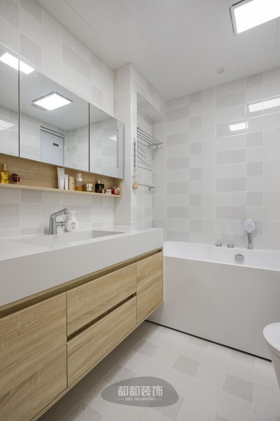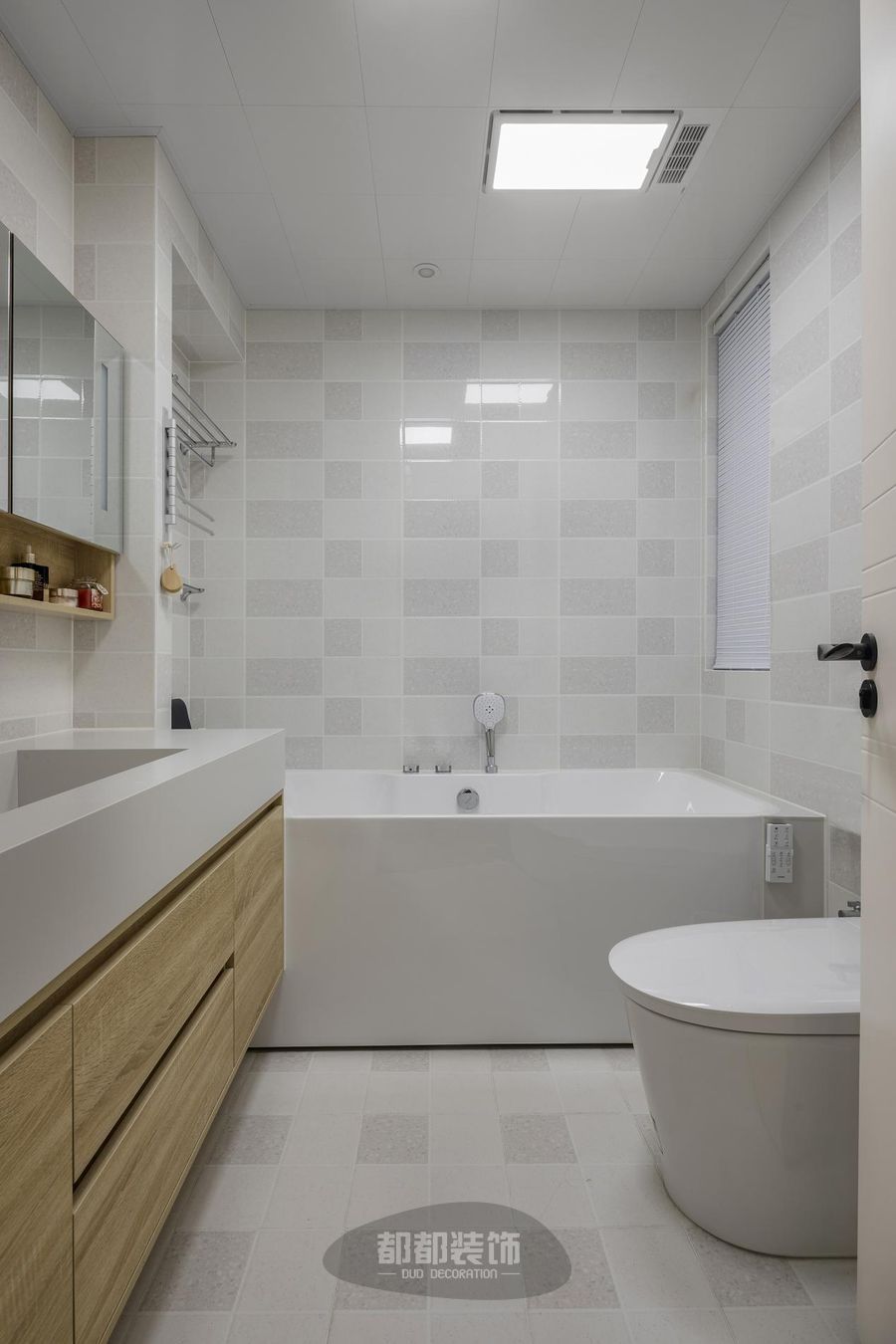 卫生间的地砖和墙砖都采用灰白拼接设计,让卫浴空间不再单调;内部添置浴缸,实现了女主人的泡澡梦,夏天放冷水在里面泡着降温解暑,初秋放温热的水保暖暖身,还有什么比泡个澡更温暖治愈的事呢?