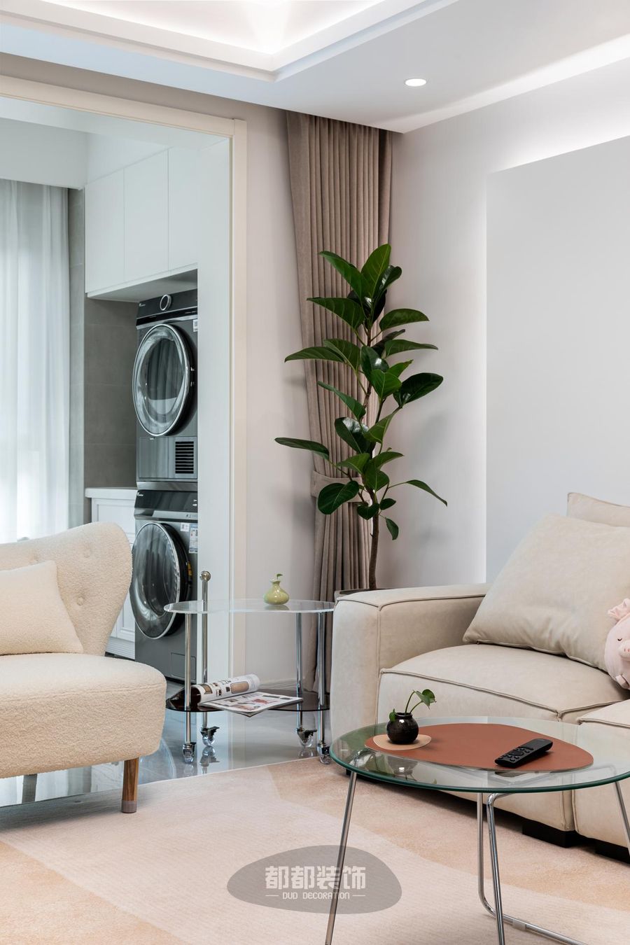 在沙发、地毯等软装布艺上加入大量浅米、棕橘等暖色调,为空间注入了温暖与柔和;简约圆形玻璃茶几,外观时尚新颖,细腻线条塑造不一样的居家美感。