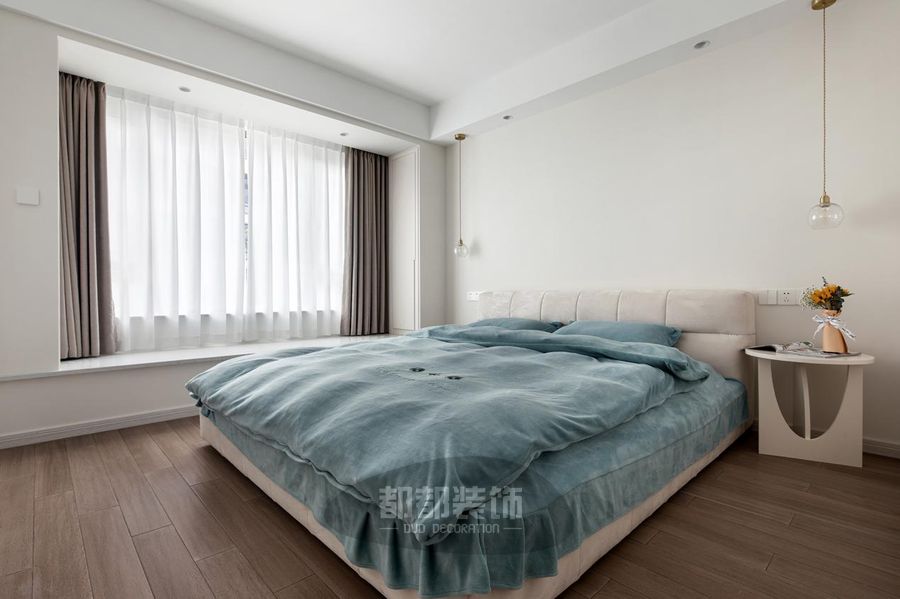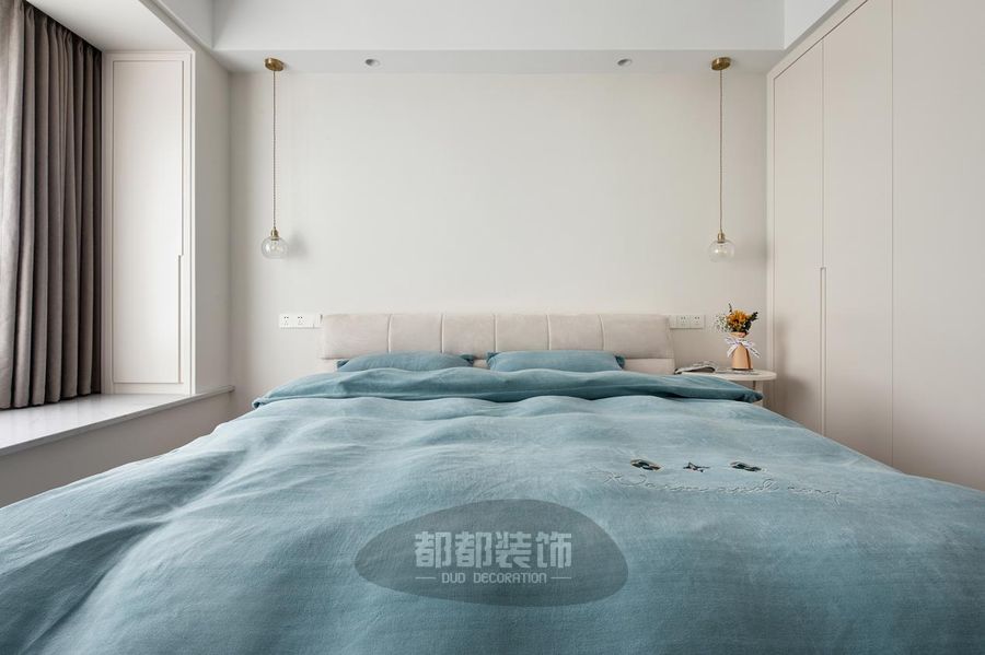 卧室的搭配简约而富有质感,那一抹雾霾蓝,打破空间素简的基调,增强了空间的节奏感,同时也为静谧的休憩区域注入了生动、温馨的情韵。