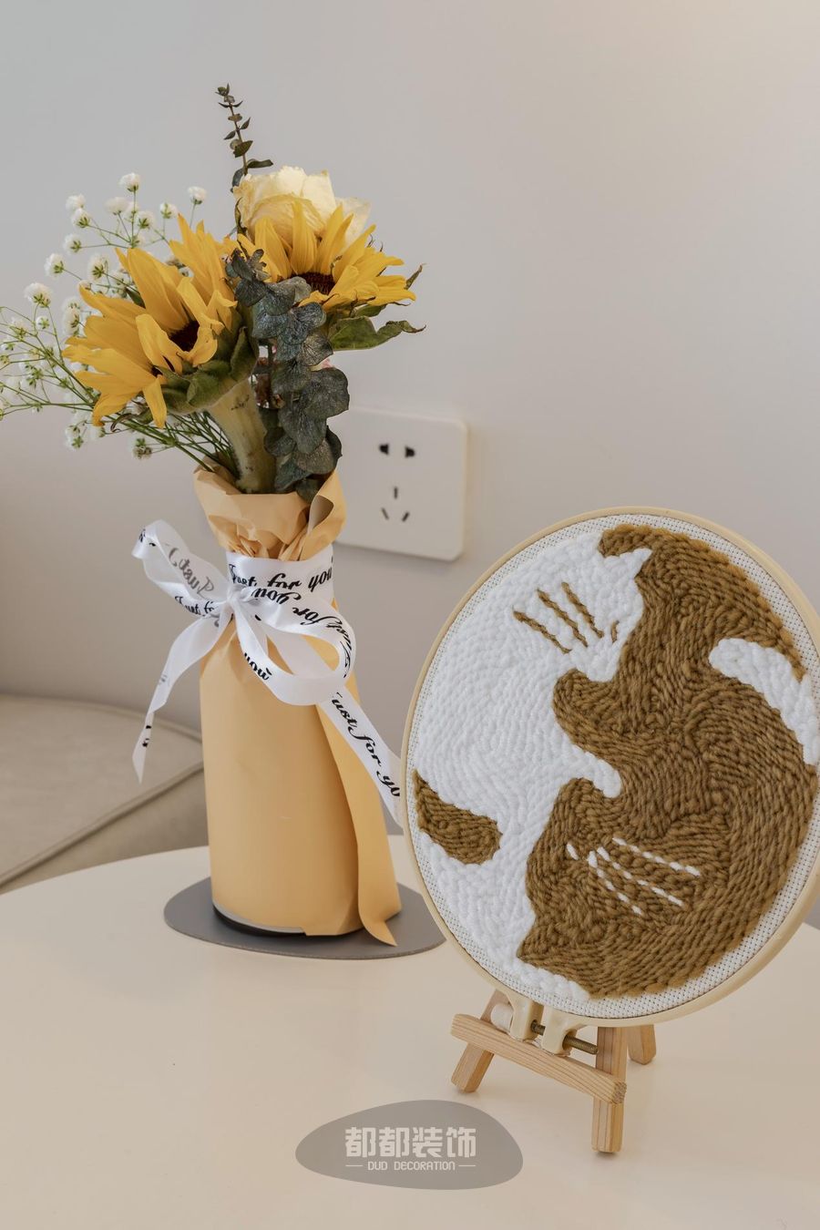 沙发靠背上放置一幅简约的抽象艺术装饰画,搭配上向日葵花束和刺绣手工艺品,轻松构建空间焦点。