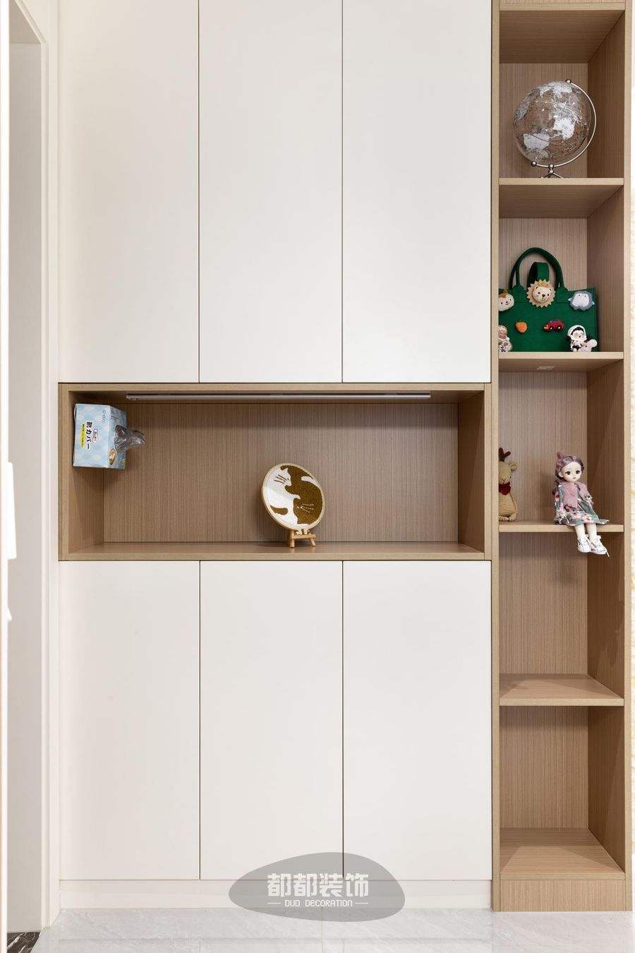 玄关处设置整面的收纳柜,扩大收纳空间,右侧特意留出了多个开放格层,搭配上地球仪,点缀上可爱娃娃摆件,给人自成一景的入户感受,避免了一进家门就是一面柜子的压抑感。