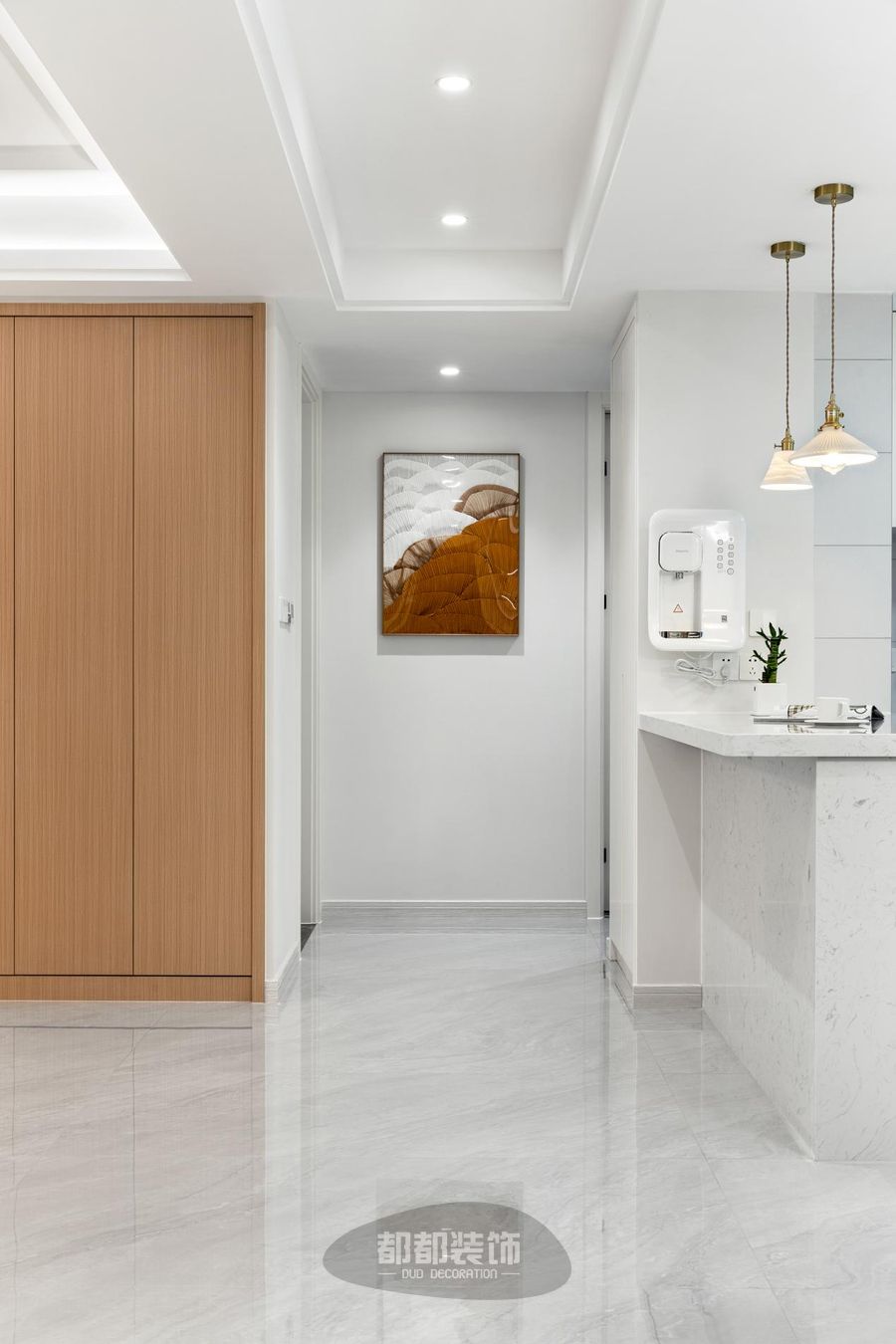 玄关处的风景装饰画,有效为空间增添装饰细节,让走廊富有变化情趣;在射灯的照射下,整个走廊空间都亮堂起来。