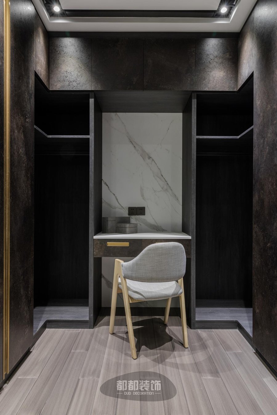 将梳妆台镶嵌入衣柜内部,大理石与木柜组成的背景墙,营造出独具个性的妆饰空间,在隐藏射灯的映衬下,精致而具优雅。