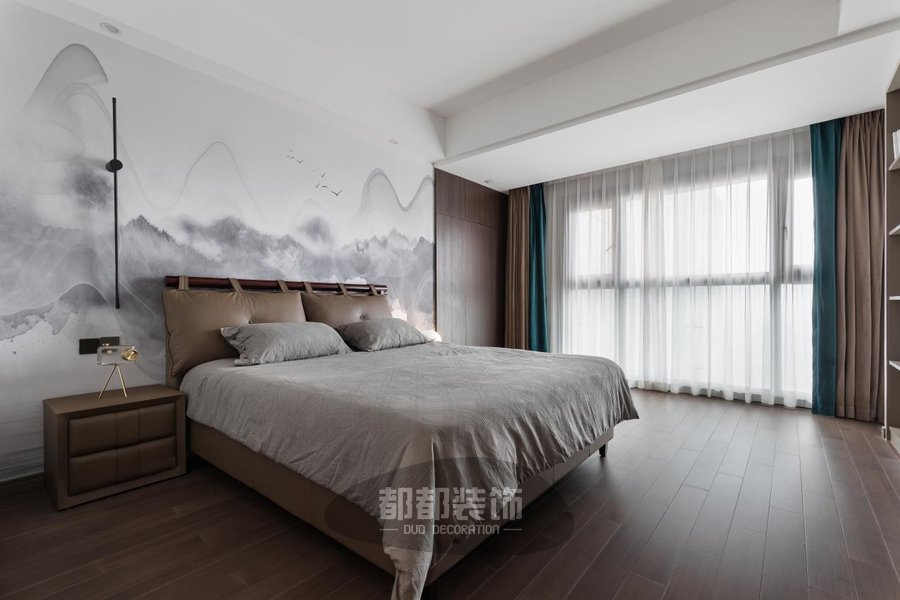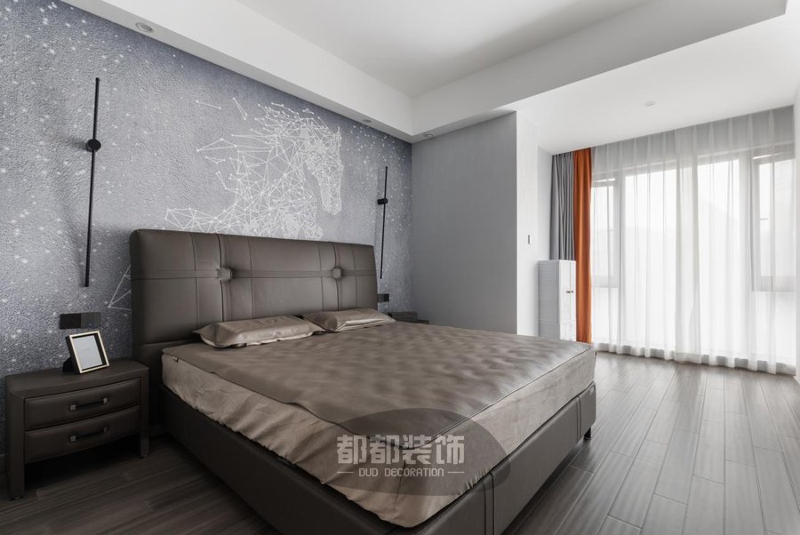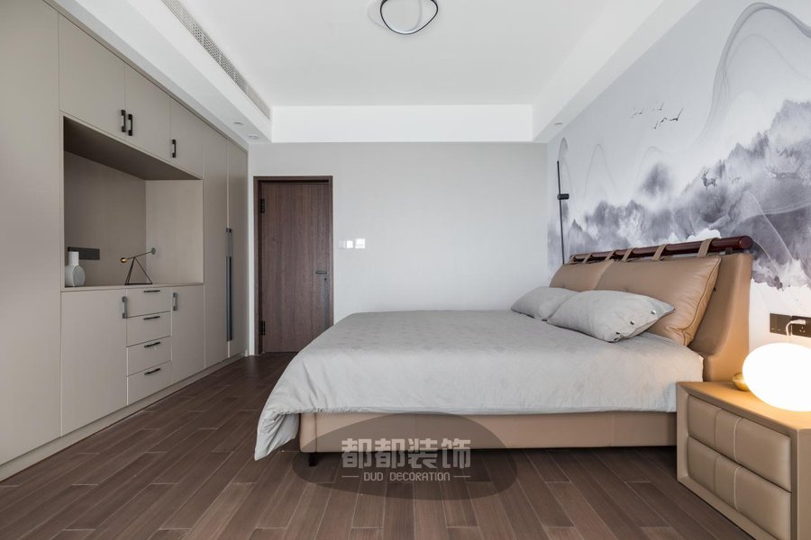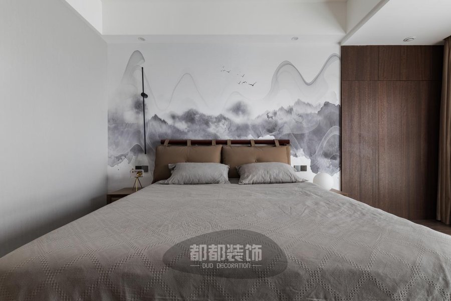 步入次卧,曹设计师以浮雕背景墙、木饰面、黑色肤感板来将墙与柜组合为一体,带来了更具轻简的生活方式。