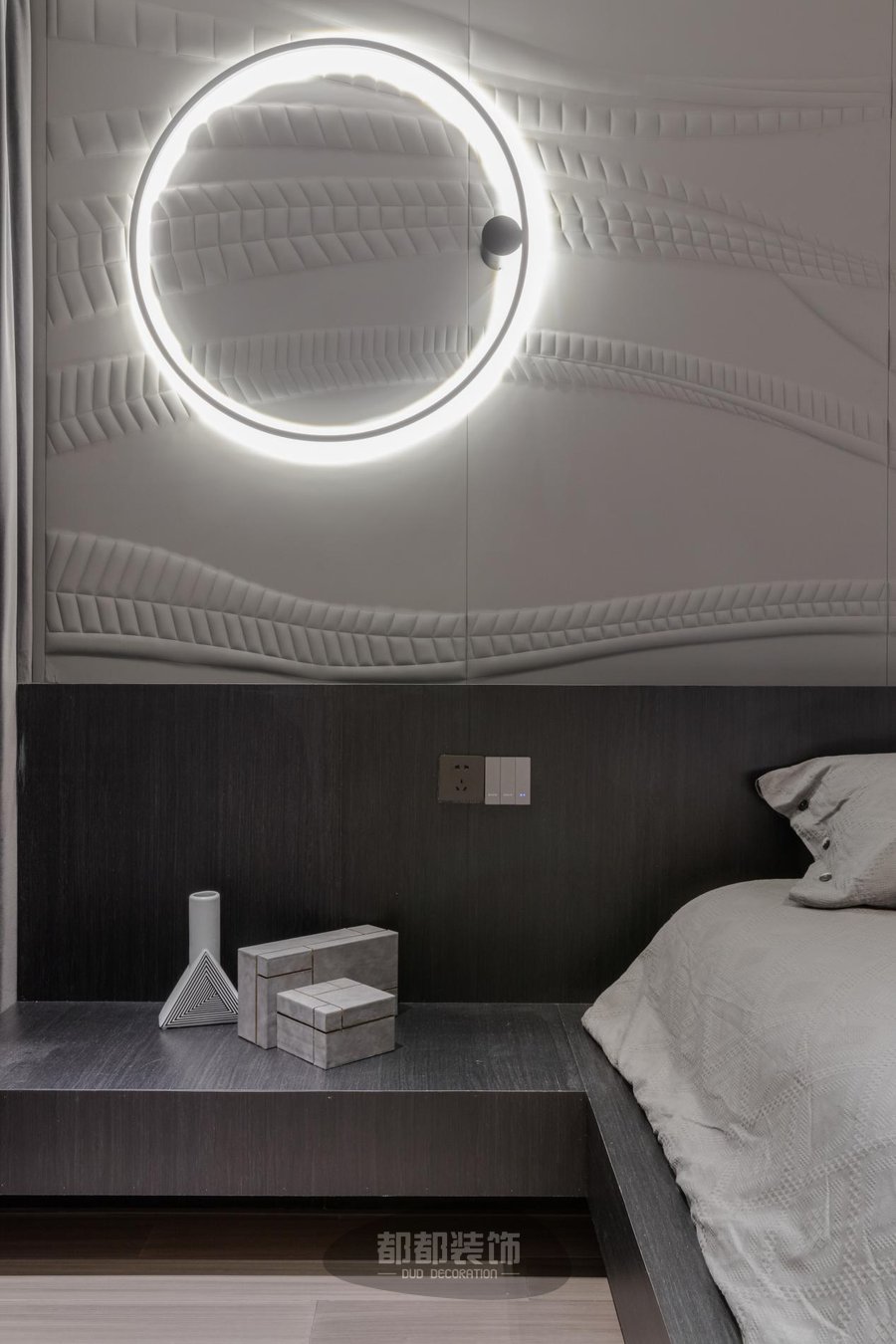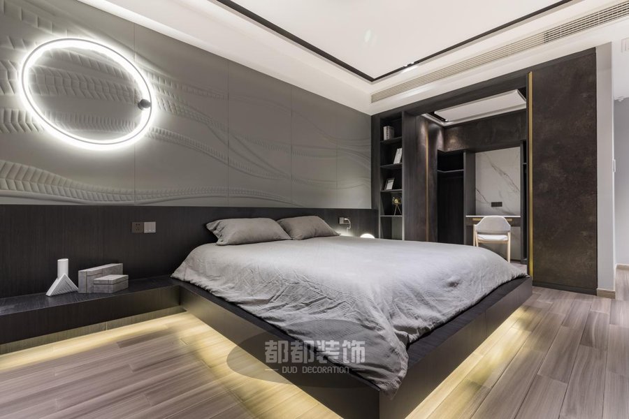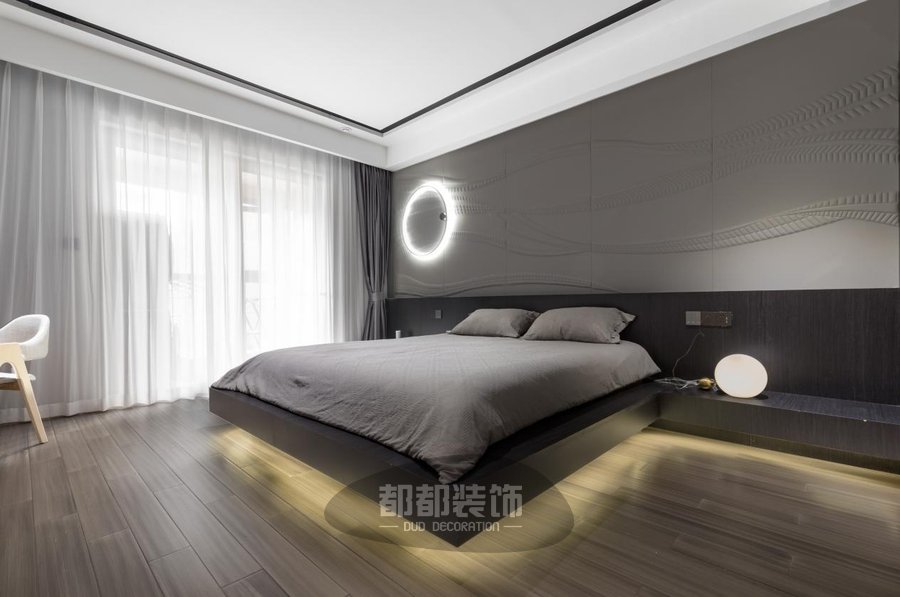卧室延续中性、克制的色调,空间的柔软之处体现于家具、床品的品质,也构建于身体的舒适与放松,悬空式的床体加上灯光设计,现代感十足。