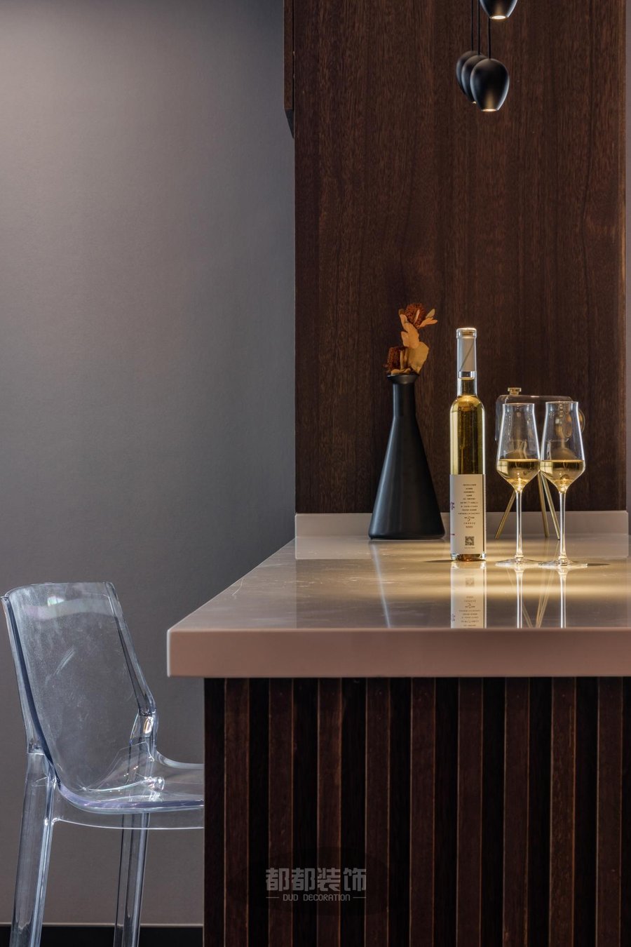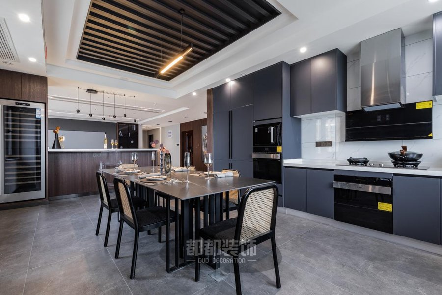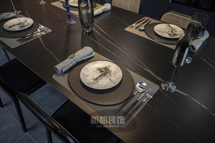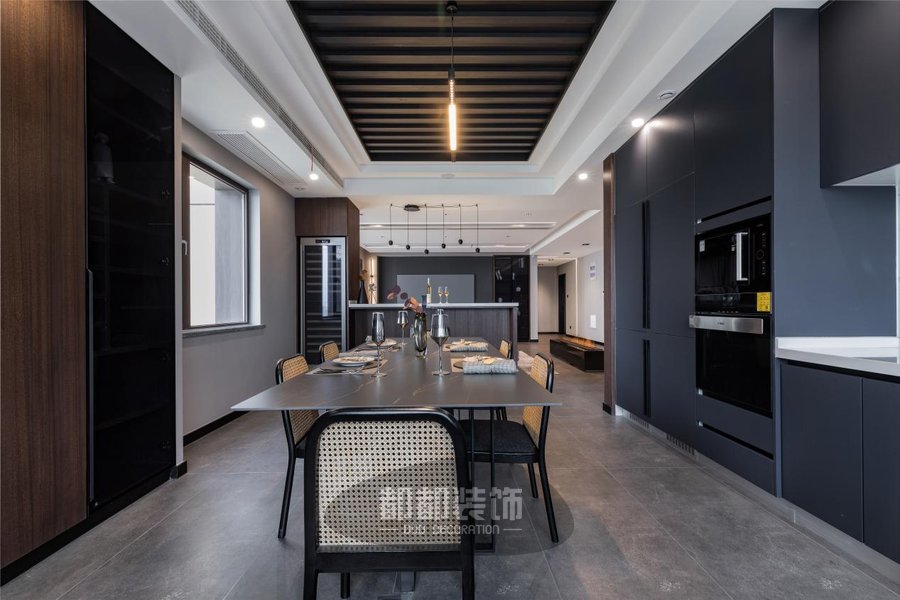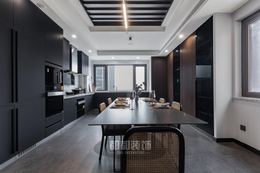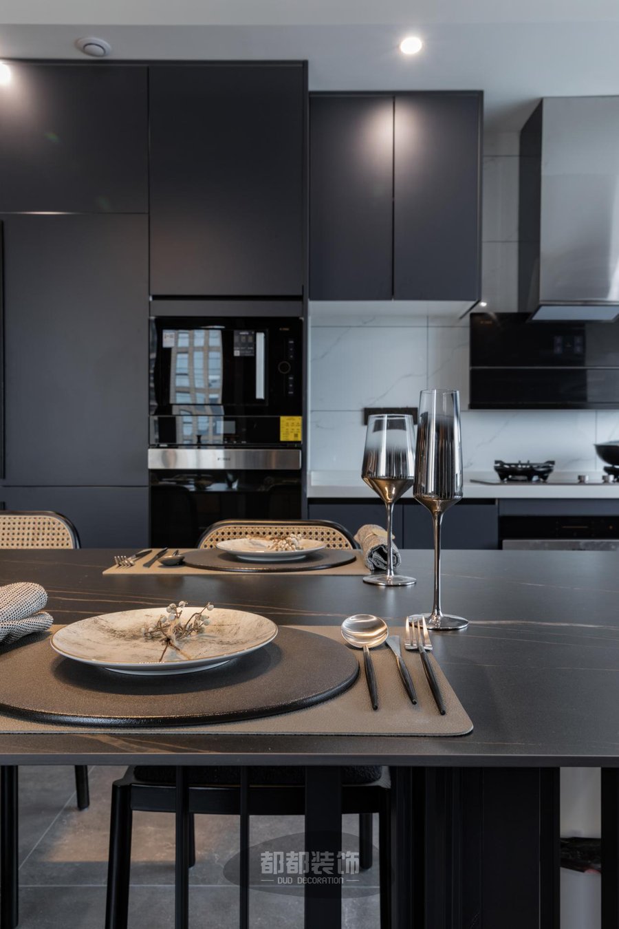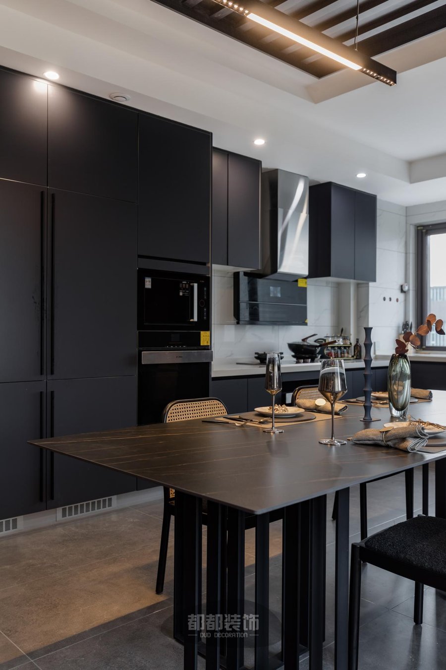 厨房与餐厅均为开放式,亚光黑的饰面在视觉上延伸着空间,为这一处空间营造一道沉稳而坚定的背景,它不跳跃,而又塑造着空间的层次,模糊了空间的界限,仿佛映照着一个更为深层的空间领域。