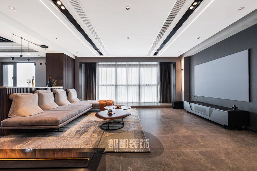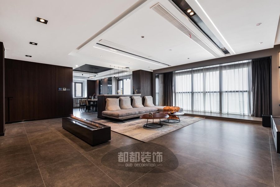 全开放式大厅设计给谢女士一家带来自在的通透感,避免了视觉给人带来的压迫性,超大面积的落地窗,俯瞰远眺,欣赏风光和夕阳美景都是绝好的选择。