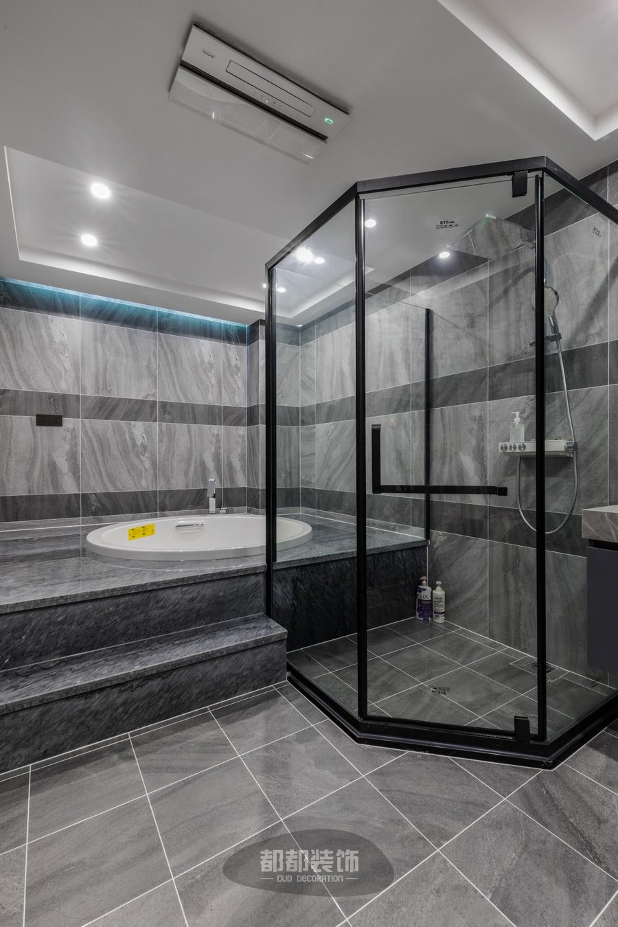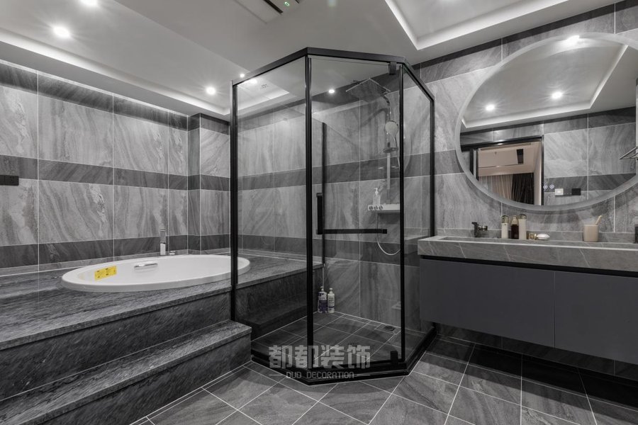 卫浴宽敞舒适,灰色大理石的层次感恰到好处,下沉式浴缸往往使人感觉更轻松,它坐落在地面上给人感觉更亲密,更加踏实,从而利于放松和减压,忙碌了一天的谢女士将身体浸泡在水中,闭上眼睛,解除一身的疲惫,轻松恬淡的品质生活由此展开!