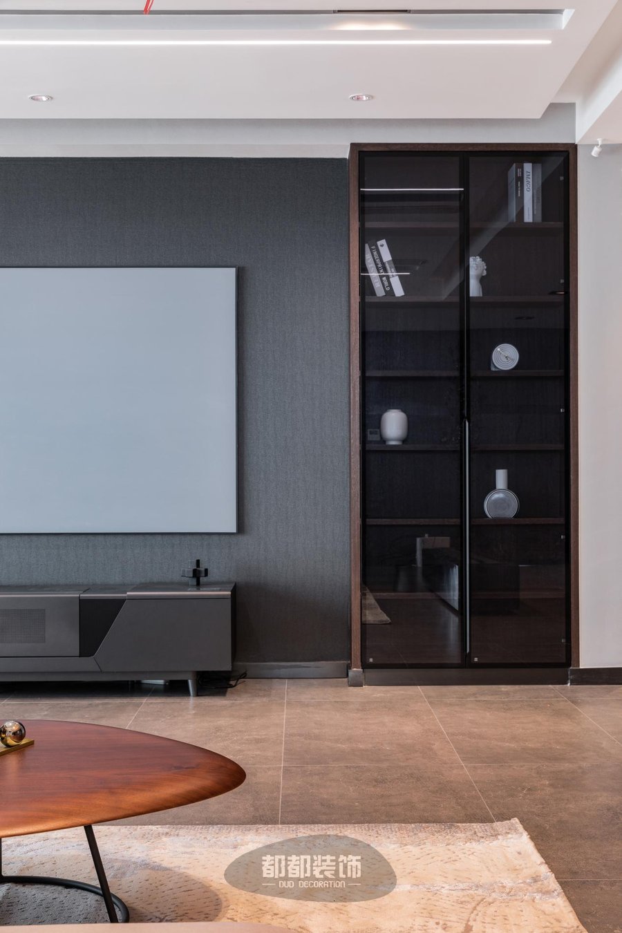 高级灰的背景墙,配以顶天立地柜和碳素黑矮柜的组合,瞬间成为电视墙收纳的主力军,灰色玻璃柜门阻碍了粉尘的污染,让柜内心爱的藏物永远保持光洁亮丽。