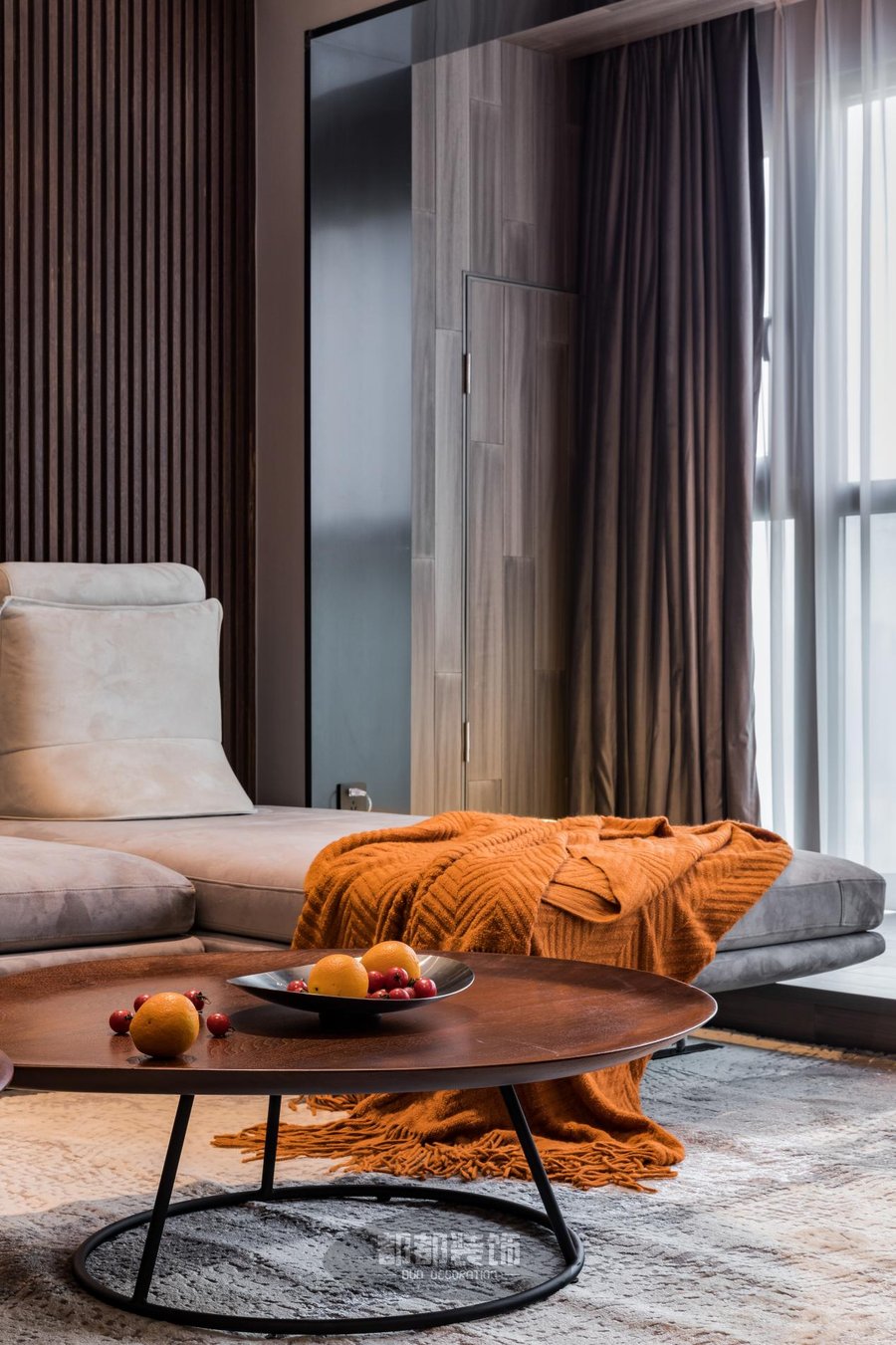 实木茶几加以现代感的配饰,小地毯、适当的搭配一些跳色的橙色毛毯就十分温馨了,沙发我们采用的是L型,主调都是灰色,靠背垫厚实柔软,坐感特别舒适,加宽的沙发坐垫也非常适合躺下来睡午觉。