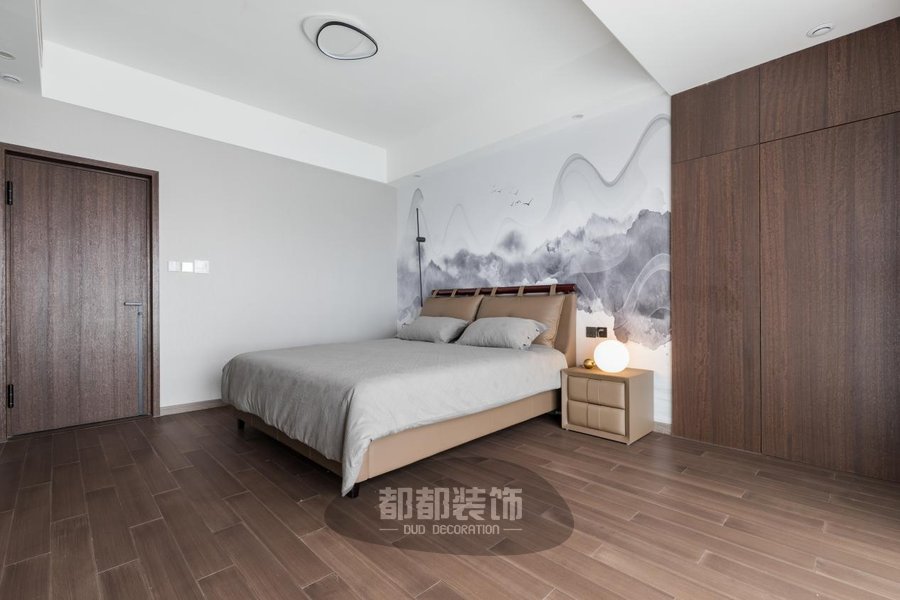 异型榻榻米的设计很巧妙,床头两边延伸出来的小部分柜体刚好可以用做简易床头柜,立体墙面+圆形灯的组合达成了视觉减负,让整个画面保持着简雅、沉稳的气质。