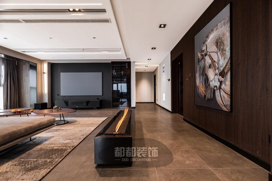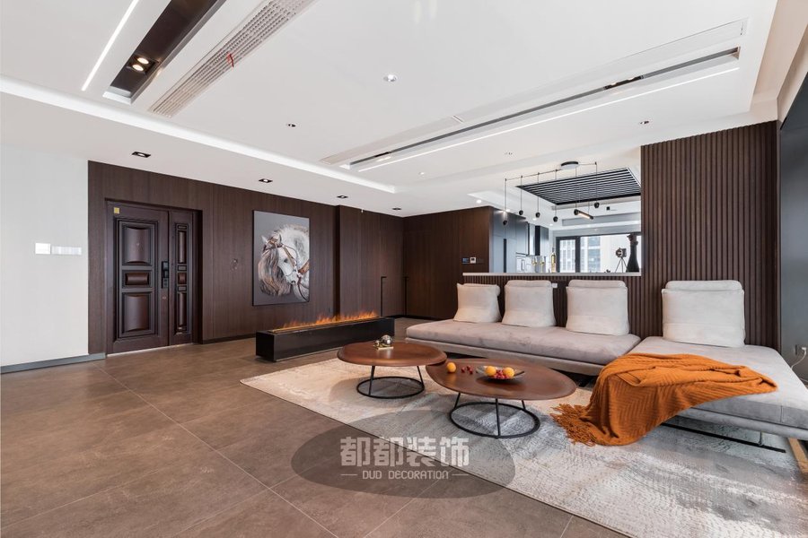 步入客厅,连贯的深色原木护墙中加入格栅的设计,在统一材质、色调的延展下,空间更显连贯协调、沉稳大气。
