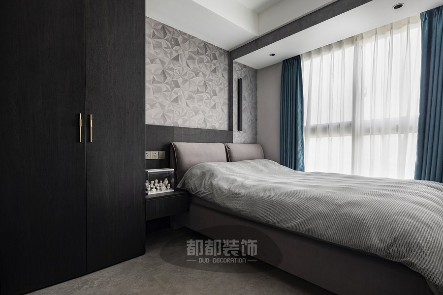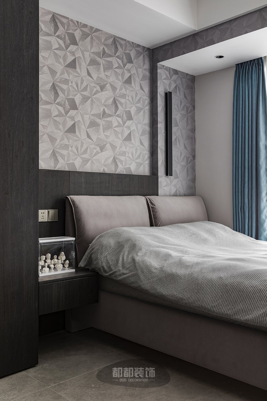 次卧空间比较迷你,床体靠墙放置在合适不过了,衣柜组合紧贴放置也是巧妙利用空间的好办法,木饰面铺贴半墙,睡眠气质更显温和,受空间限制,将原本的落地式床头柜打造成悬空样式,节约空间的同时也和整体灰色系很搭。
